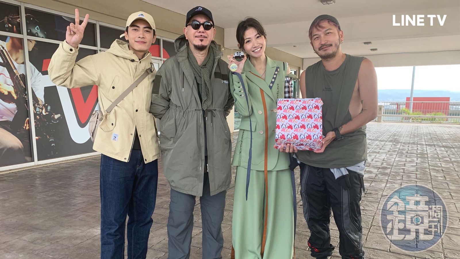 黃秋生(左二)與KID林柏昇(右一)、宋柏緯(左一)共同主持原創美食交友實境節目《開著餐車交朋友》,邀來嘉賓李千那(右二)。(LINE TV提供)發布時間:2020.12.19 16:25 臺北時間