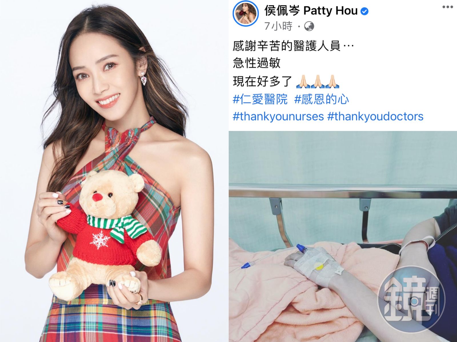 侯佩岑一開始還在IG限動開心貼上大啖生日大餐的照片,才沒過幾個小時,畫面就突然來到仁愛醫院病床上,她寫道「感謝辛苦的醫護人員⋯急性過敏 ,現在好多了。」看到侯佩岑左手插著點滴,虛弱躺在病床上的樣子,看樣子在醫院至少得待上數小時,讓不少粉絲感到不捨。