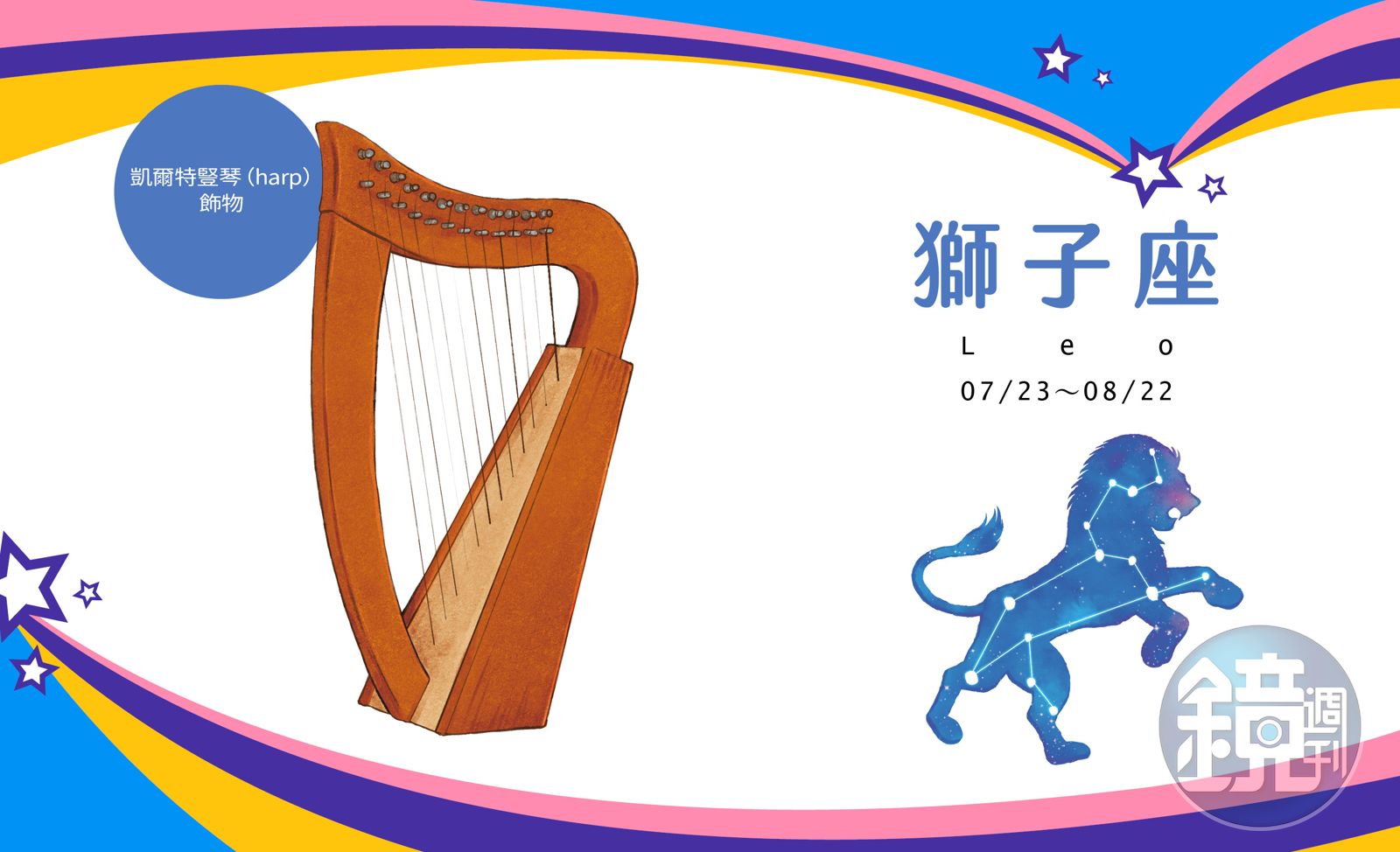 凱爾特豎琴(harp)飾物:豎琴在西洋神話是太陽神阿波羅的神器,因此與守護星為太陽的獅子座很搭。歌德曾說:音樂是天使的語言。而天使手上拿的樂器就是豎琴。由於音色具有撫慰、療癒、摧毀或導引的靈性魔力,曾被畢達哥拉斯加入宗教色彩用來做音樂治療。豎琴如今常被用來作化干戈為玉帛、維繫和諧美滿與忠實關係的幸運物。
