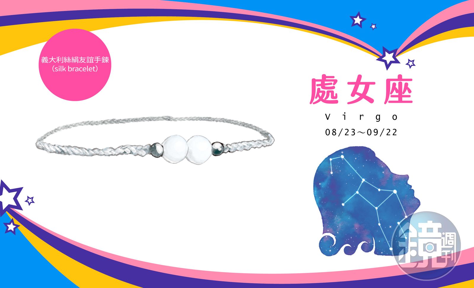 義大利絲絹友誼手鍊(silk bracelet):今年工作負荷接近爆表的處女座,工作與情感上都需要有知心好友分憂解勞,年度吉祥物非「友誼手鍊」莫屬。金屬、棉線或絲綢各式材質不拘,但以高級絲綢重鎮義大利科莫城(Como)的絲絹手鍊,最受世人追捧。「友誼手鍊」源自印第安繩編腕鍊,鐵桿好友(BFF)互贈手鍊,象徵愛與和平、友誼長存的祝福與承諾。