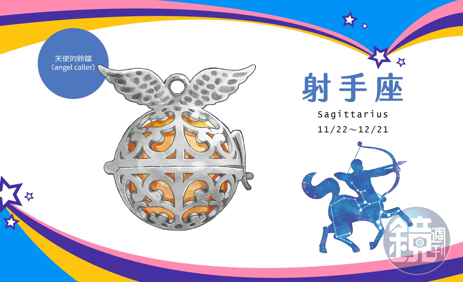 天使的鈴鐺(angel caller):射手今年是忙碌而奔波的一年,匆忙的心特別需要沉澱與呵護。「天使鈴鐺」又叫「和諧鈴鐺」,是顆會發出輕柔鈴聲的球狀鈴鐺,聲音極為療癒舒心。馬雅傳說,旅行、創作或孕育新生命時,鈴鐺可以召喚天使守護,是能為佩戴者帶來美好幸福、平靜祥和的護身好物。象徵愛、守護、自信、勇氣、堅持與力量等祝福。