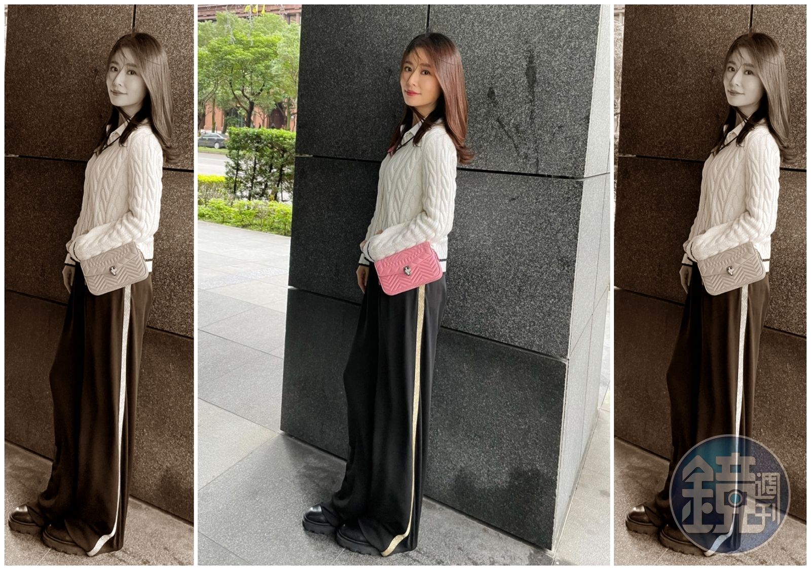 寶格麗品牌代言人舒淇配戴Serpenti Forever白色腰包出席BVLGARI BASEL 2019全球記者會。NT65,000。(寶格麗提供)林心如時尚品味一向有口碑,她有別於品牌代言人舒淇、品牌大使Kōki的腰包配戴方式,以休閒的穿著詮釋這款粉色小包:她穿著白色襯衫、針織V領上衣、垂墜感強烈的休閑寬褲為外出look,以斜背方式,呈現這顆淺金鍊帶的糖果石英色腰包。