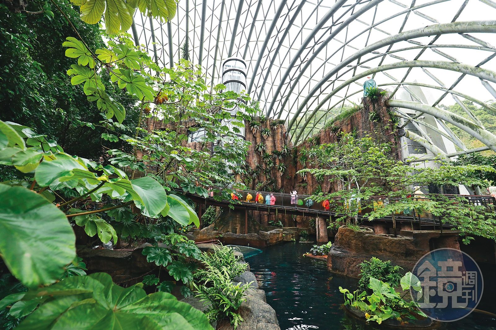這也是一座符合多樣性概念的展館,大致分為2個空間,樓上的步道往下望去是個水池,頭頂上的鳥類飛舞,不時發出鳥叫聲,偶爾還會遇到孔雀靜靜佇立身旁,往下走則像是走入海底水族館,各式奇異的魚類遨遊其中,讓遊客們看得入神,闊葉林中還藏著不少小動物,一轉身,棉頭絹猴家族紛紛跑出來,看著對牠們嘖嘖稱奇的遊客,是一處向生命學習的自然教育場域。