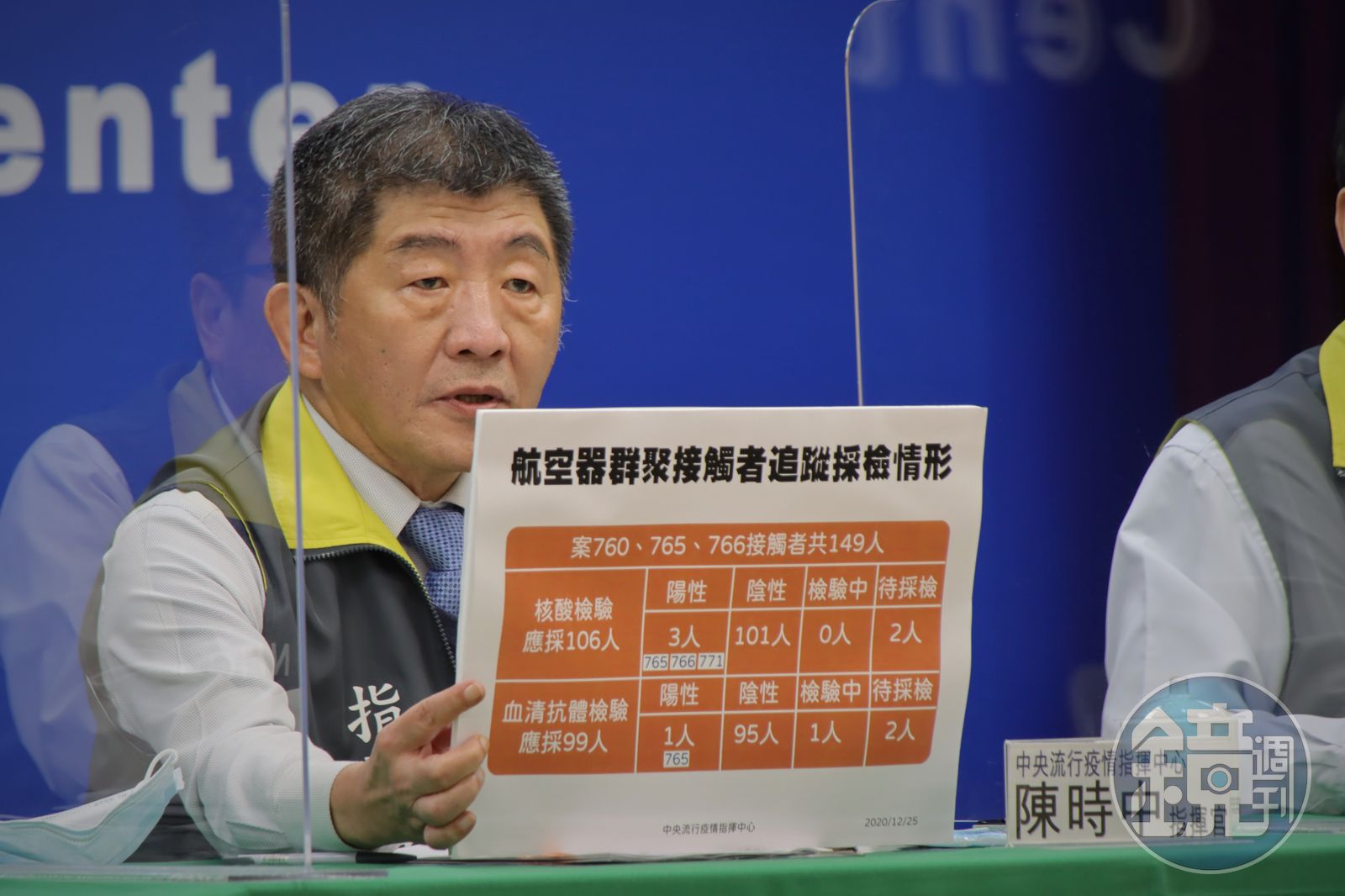 陳時中指出,針對紐西蘭籍機師(案765)及2名機師(案760、766)航空器群聚擴大匡列149人,其中106人應該接受核酸採檢,其中101人檢驗結果陰性,扣除3名染疫者,仍有2人在國外待採檢。