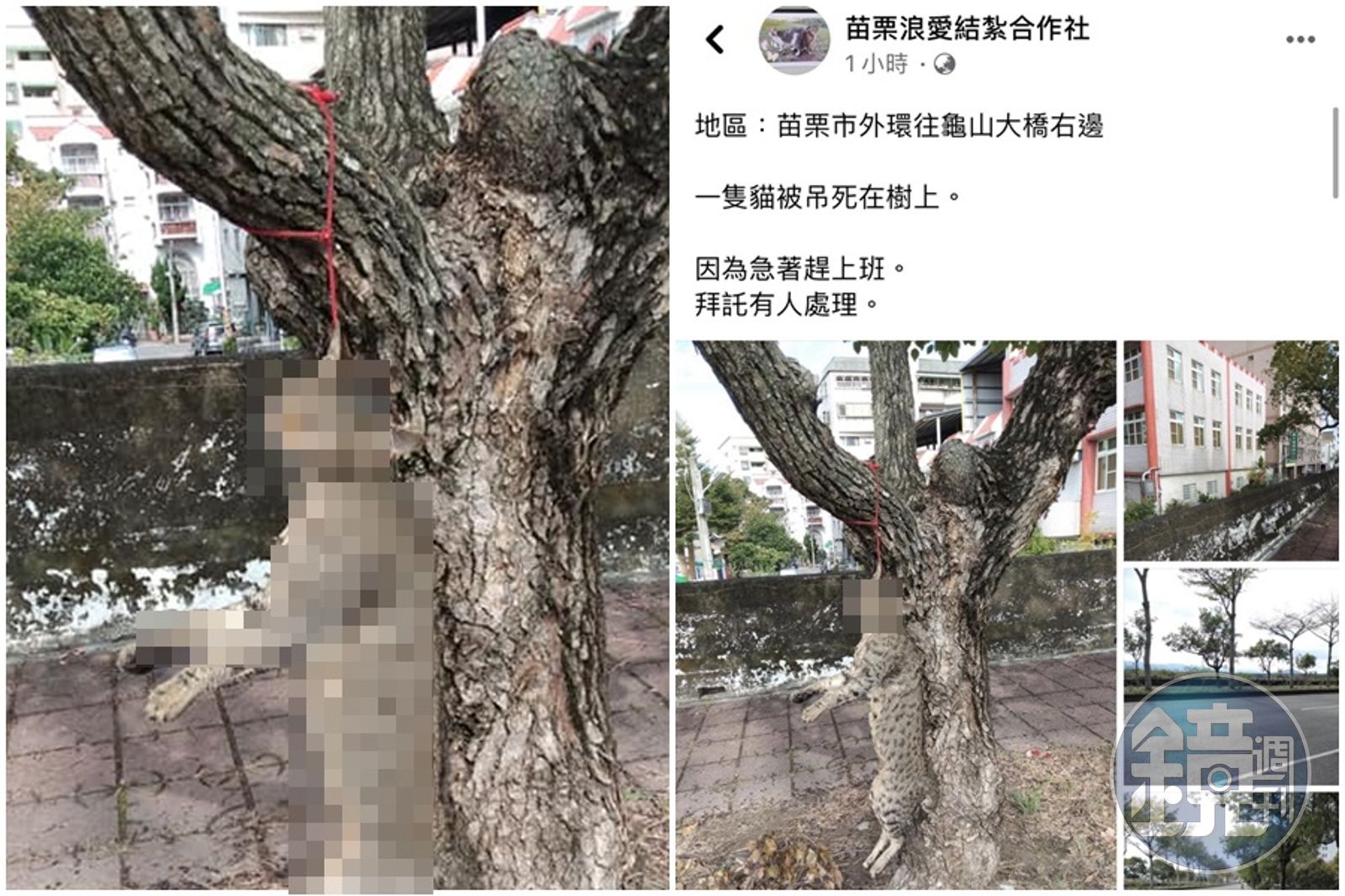 稍早臉書「苗栗浪愛結紮合作社」粉絲專頁也網友投稿表示,苗栗市外環往龜山大橋右邊,「有一隻貓被吊死在樹上」,投稿人礙於趕上班,盼有人去處理相關事宜。 文章一曝光,秒掀起網友高度關注,接著更被大票網友瘋傳各大社團,照片中只見一隻虎斑貓慘遭人用紅線吊掛在樹上,睜著眼睛、四肢僵硬,畫面怵目驚心,相當駭人。