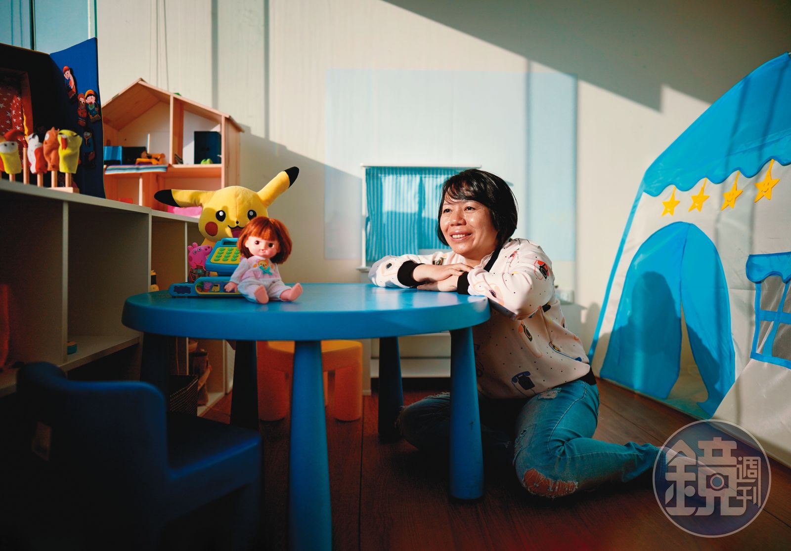 我在台東太麻里長大,傳統觀念是重男輕女、打罵教育,媽媽說女生是賠錢貨,我是長女,小時候一直在煮飯燒水,下了課去農田放水餵雞、幫忙農事。家裡窮,小時候喜歡玩具沒錢買,所以現在我會買很多玩具給小孩,陪他們玩,也療癒自己。