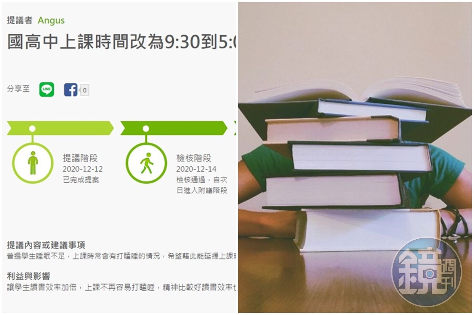 提案「國高中上課時間改為9:30到5:00」,內容為「普遍學生睡眠不足,上課時常會有打瞌睡的情況,希望藉此能延緩上課時間,更讓學生讀書效率加倍,上課不再容易打瞌睡,精神比較好讀書效率也比較高」,短短幾日,提案就達正式附議門檻,目前僅等待關機關於明年2月23日前回應。