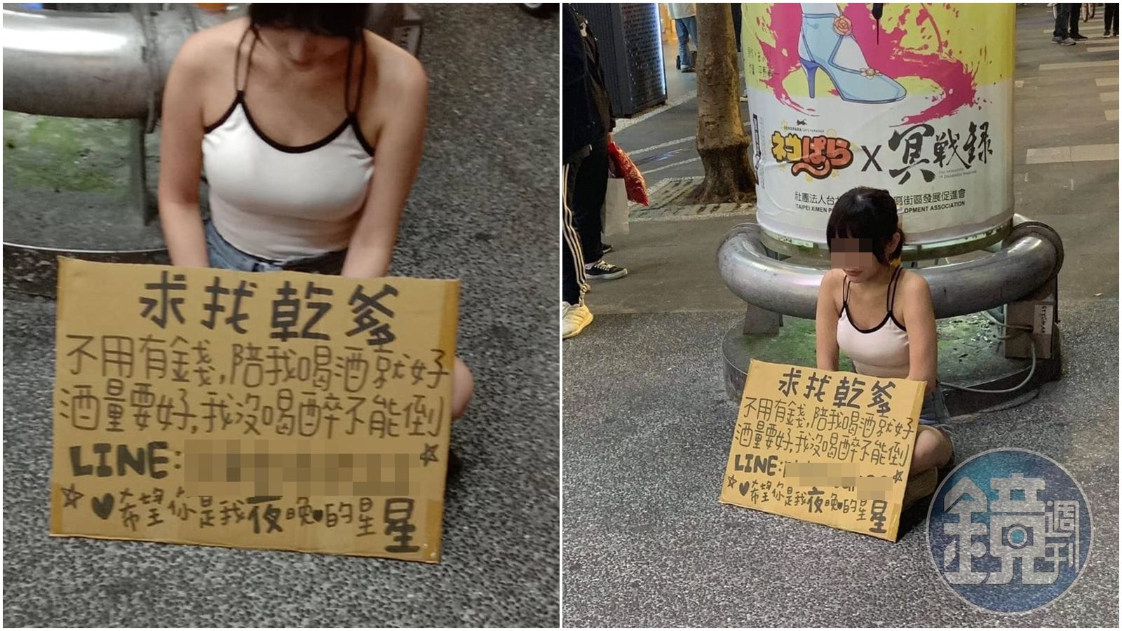 距離一名蘿莉裝女子於西門町街頭放看板徵男友後,相隔兩週就出現類似情節,不過這次不徵男友改徵乾爹!數名網友於臉書社團「爆廢公社2館」貼文,指出一名穿著清涼的女子晚間坐在西門街頭,身前擺了一張紙板,明確寫著「求找乾爹」,接著備註不用有錢,但要酒量好且陪她喝酒,在她喝醉之前不能倒,下頭也附上Line帳號,文末則嬌喊「希望你是我夜晚的星星」。
