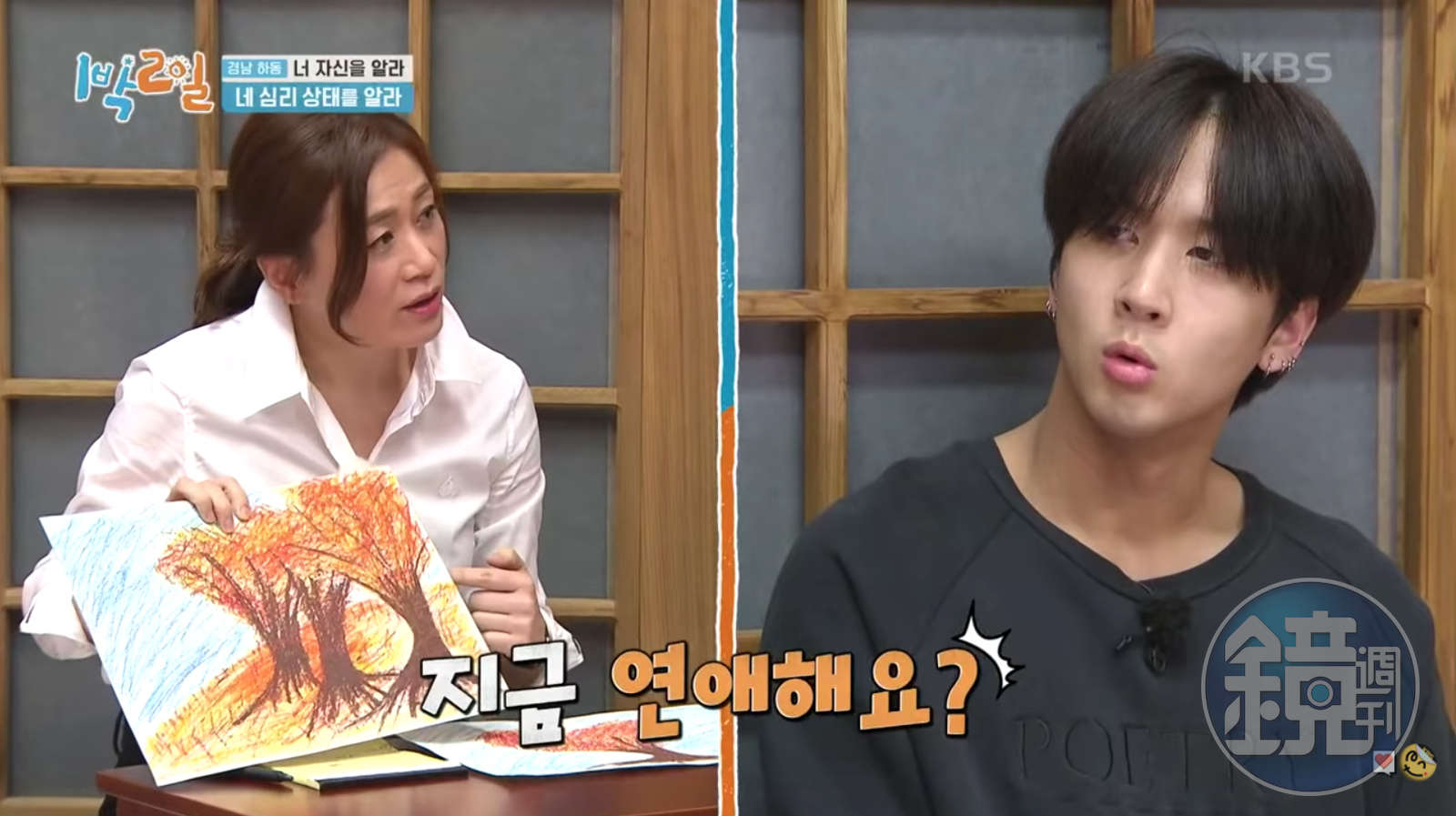 VIXX成員Ravi(右)在《二天一夜》心理測驗被老師問:「請問,是戀愛中嗎?」(截圖KBS entertainment Youtube)發布時間:2020.12.27 17:18 臺北時間
