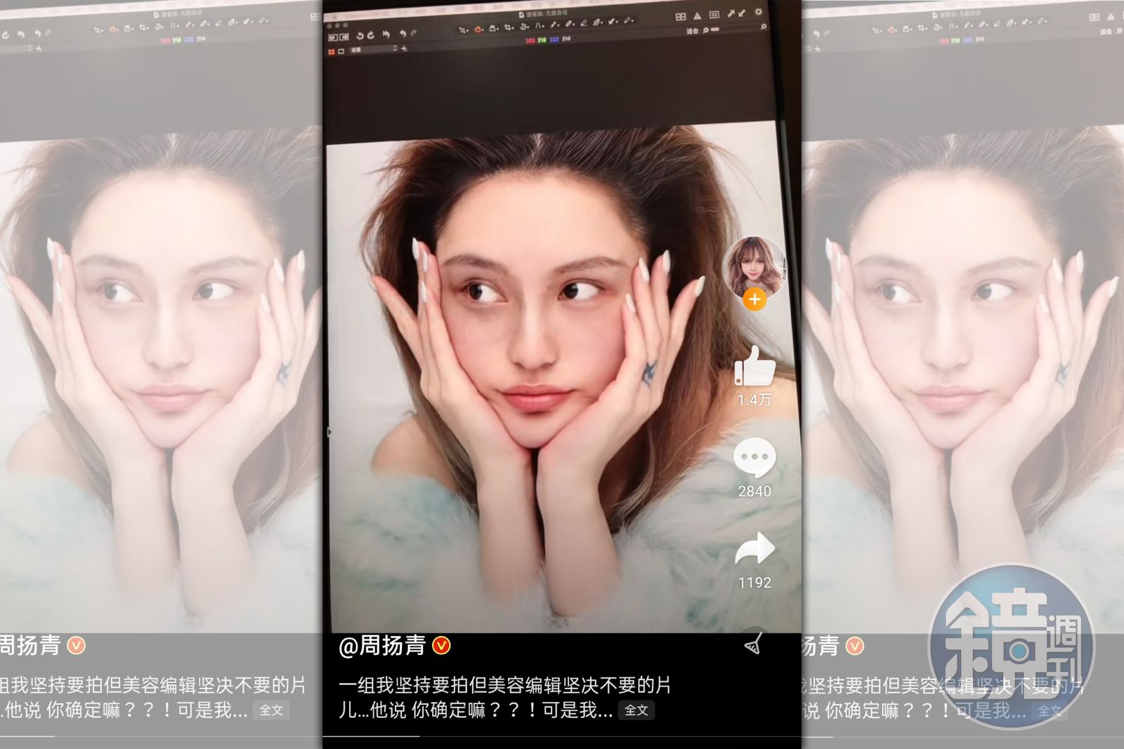 周揚青和羅志祥分手後,積極經營個人服裝品牌,觸角更延伸至演藝圈,在節目上讓粉絲看到她更多私下真實的一面。昨(30日)周揚青發文曬出一系列照片說:「一組我堅持要拍但美容編輯堅決不要的片兒……。」 周揚青表示工作人員一再確認:「你確定嗎?」但她仍堅持要放,「我覺得女孩子卸妝的時候也很可愛啊對吧。」素顏照片中可看出周揚青白皙的好膚質,完全沒有細紋斑點,與平時模樣其實差距不大,也讓網友驚嘆「卸妝的樣子也很可愛,真的很誠實」「周周怎樣都好看」「以後不要P照片了」。