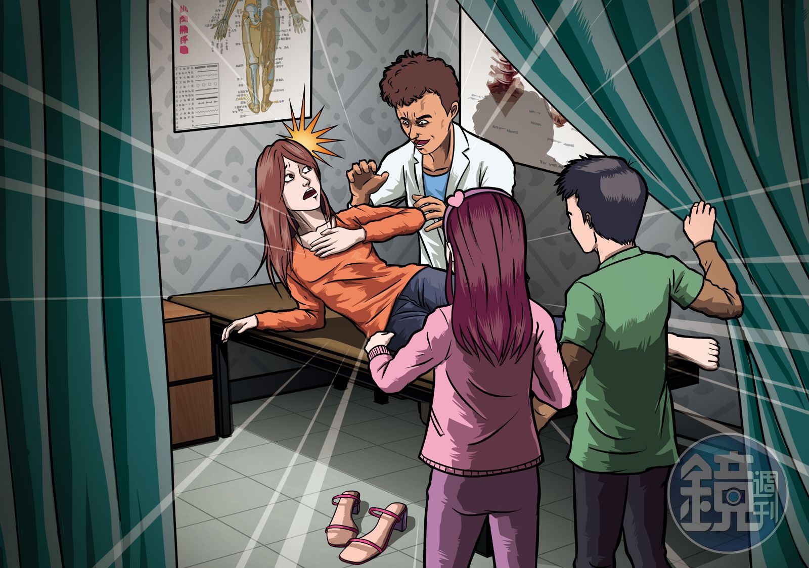 由於吳男一直搓揉小花的胸部,還不時觸碰敏感地帶,一時反應不過來的小花,正想尖叫要求對方停手,不料小孩正好拉開診療簾,看到這不堪的一幕,還開口問:「媽媽你在幹嘛?」