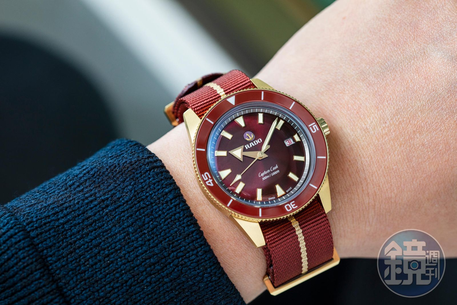 伴隨著最新的「鋼鐵紅」配色登場,雷達還加入新的NATO錶帶樣式,而且包括先前的藍、綠、棕三色也都補齊了。NATO帶除了對應不同面盤顏色,中央縫線也呼應青銅錶殼,於此同時NATO帶扣也是青銅材質的,而且金屬部件的亮霧面的處理做得很好,我尤其喜歡把船錨Logo做在錶扣、RADO名稱在側邊這個設計。