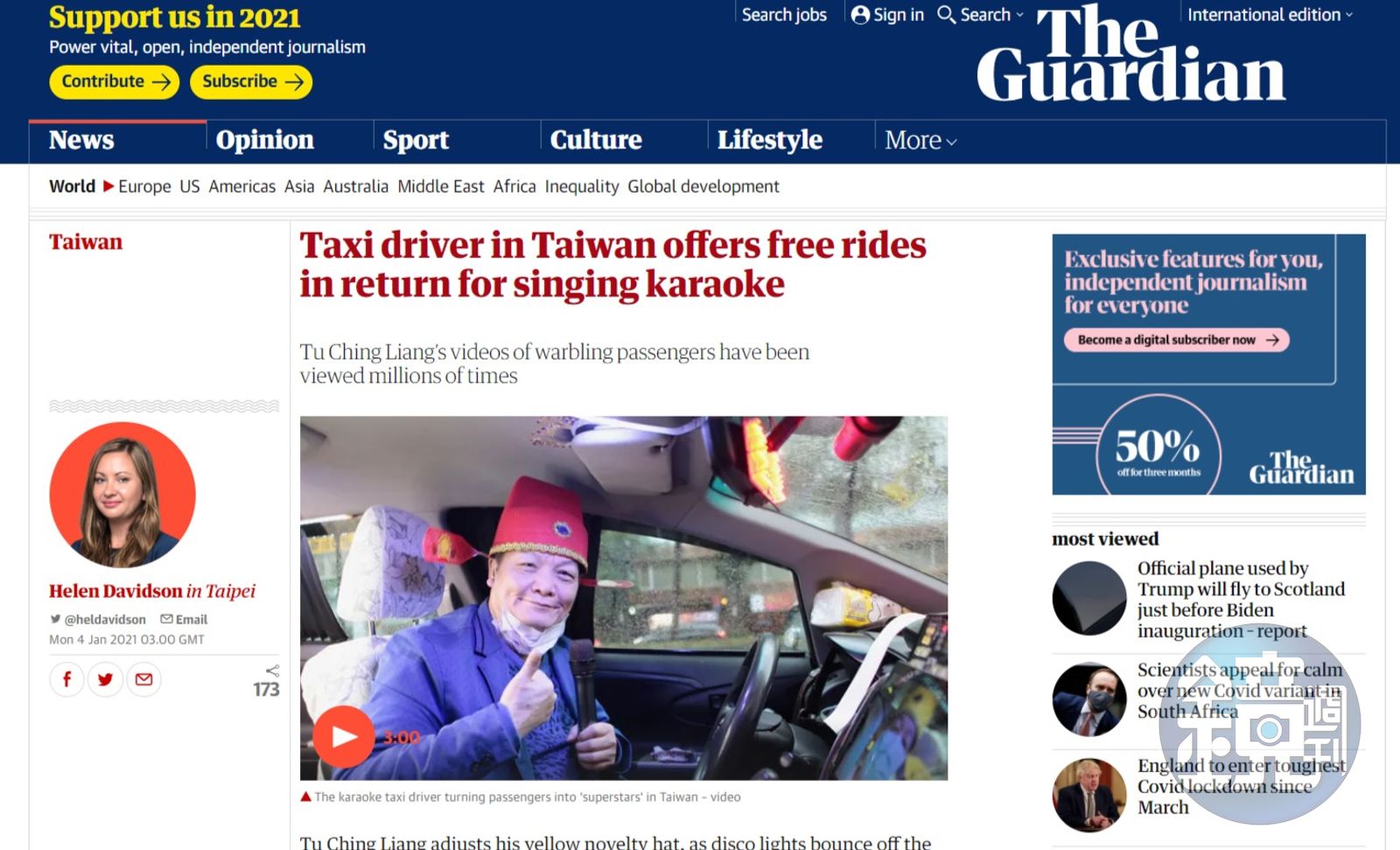《衛報》駐台北記者海倫戴維森(Helen Davidson)寫道:「在這座愛唱歌的城市,到處都能找到卡拉OK,就連計程車也不例外。」台灣的計程車App中,在「英語司機」「無障礙」選項旁,甚至有個「卡拉OK」選項。記者親自坐上「K歌運將」涂清涼的車,採訪當天台北陰雨綿綿,車內氣氛顯得格外溫馨。