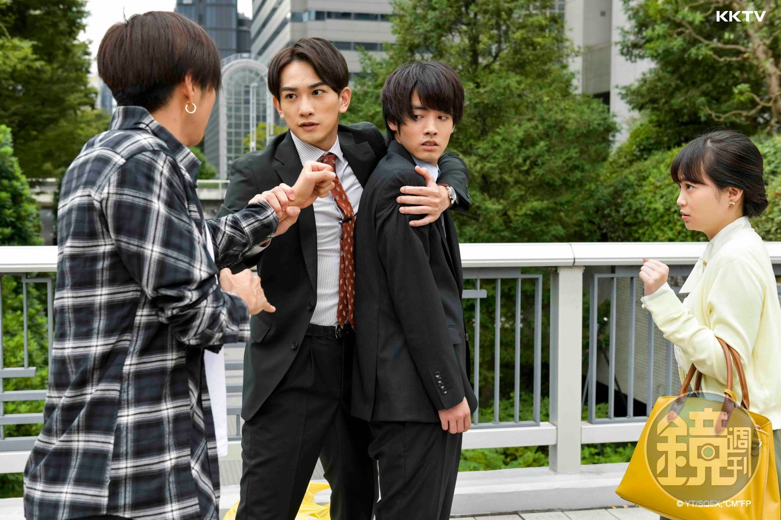 赤楚衛二(右二)和町田啓太(左二)實際身高相差3公分,但赤楚因角色有些駝背,看起來差距更大。(KKTV提供)發布時間:2021.01.12 05:59 臺北時間
