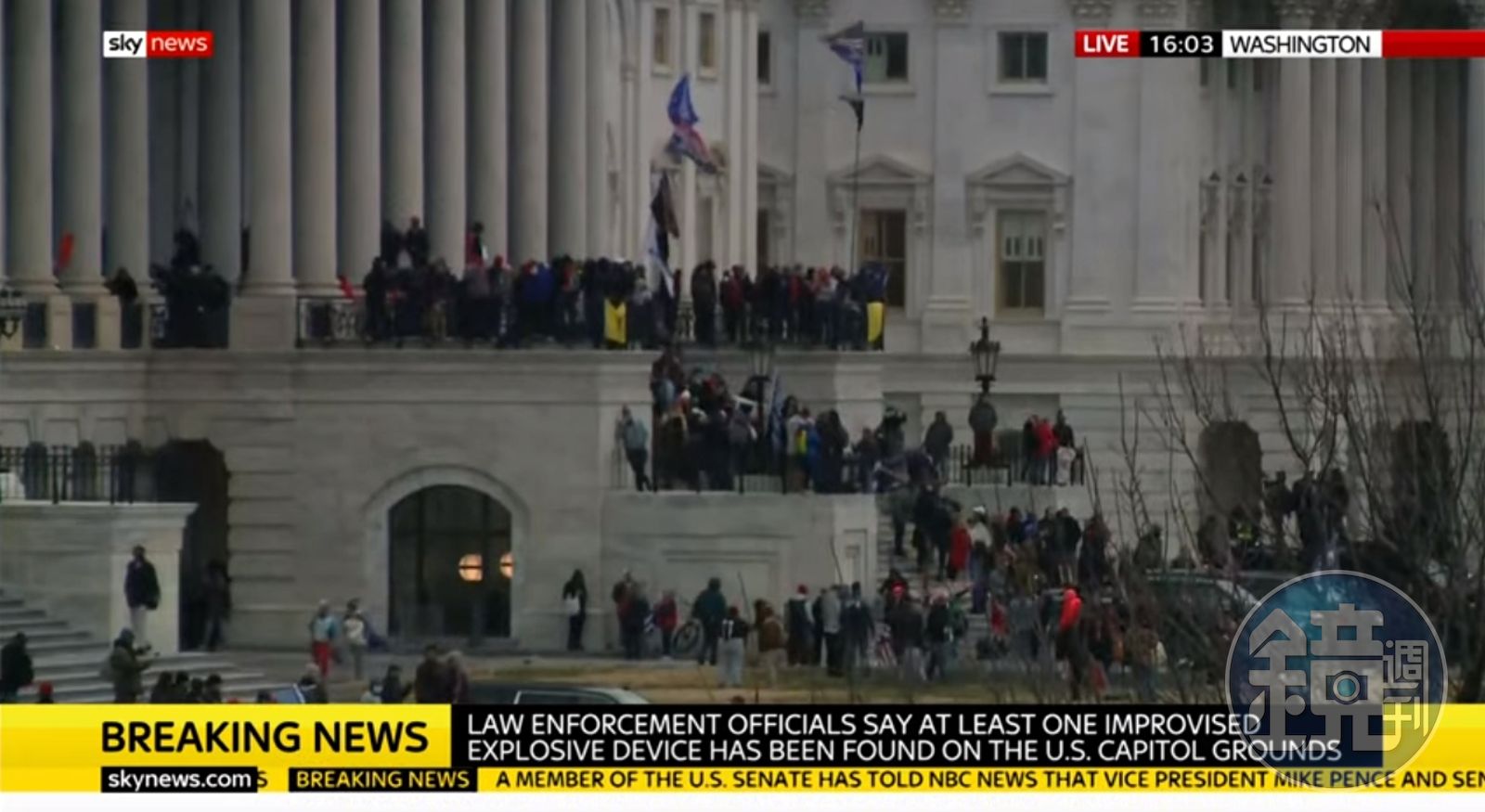 美國國會大廈遭川粉暴動闖入,警方還發現2枚爆裂物。(翻攝自Sky News)發布時間:2021.01.07 08:43 臺北時間