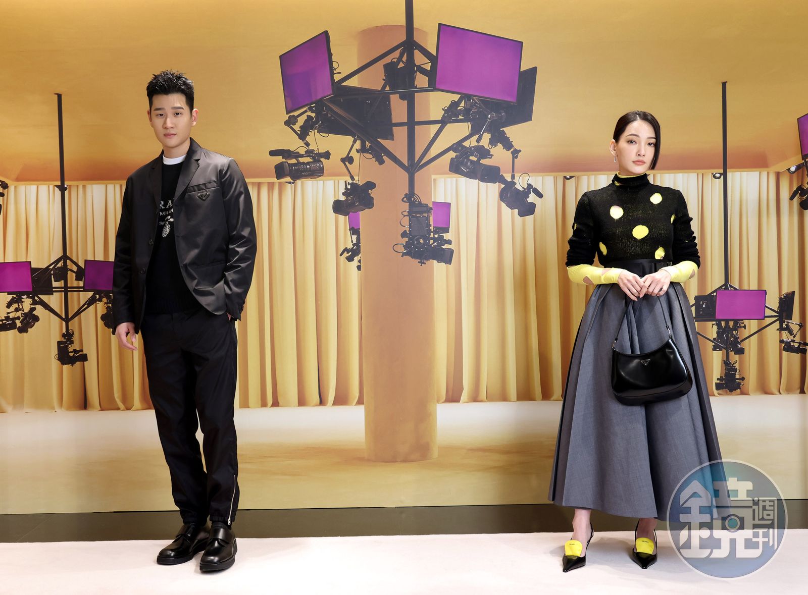 周興哲與林映唯示範PRADA春夏2021系列服裝:林映唯身穿高領挖洞毛衣NT$33,000、挖洞內搭NT$42,000、傘狀長裙NT$130,000、拼色高跟鞋NT$33,500、Cleo手提肩背包NT$62,000;周興哲身著圓領毛衣NT$53,000、單排扣西裝外套NT$76,000、西裝長褲NT$37,500、拋光皮革德比鞋NT$33,500。(PRADA提供)發布時間:2021.01.13 16:40 臺北時間
