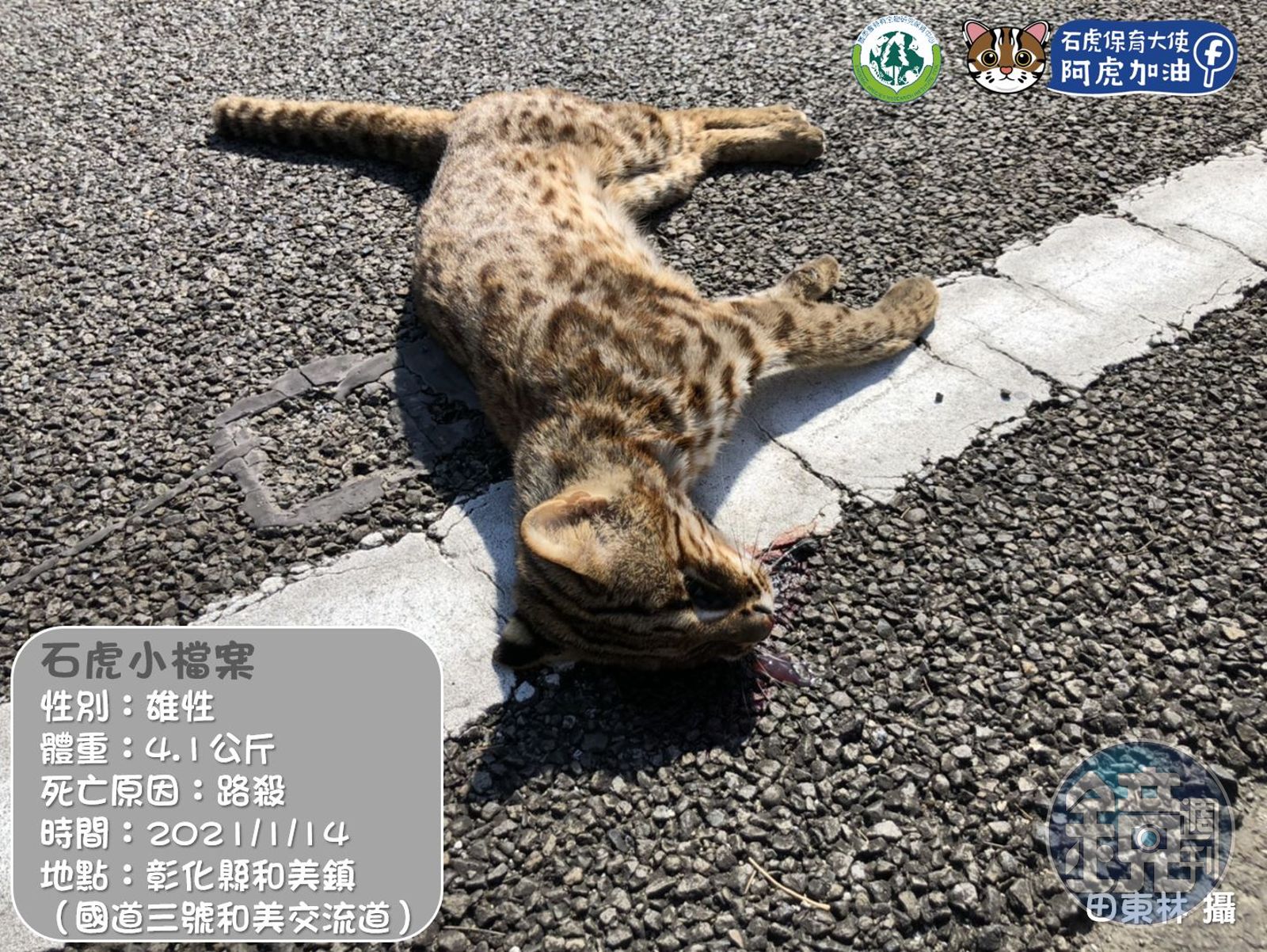 特生中心石虎研究團隊在臉書粉專「石虎保育大使 阿虎加油」貼文指出,14日接獲一位來自苗栗西湖的田先生通報,表示他在彰化縣和美鎮的國道三號和美交流道發現疑似石虎路殺屍體,最後由高公局人員前往將屍體帶回,死亡個案為4.1公斤的雌性個體;由於此路段沿著烏溪,特生中心指出,河道確實是石虎重要的棲地之一,兩側的農地也是石虎的覓食範圍,隨著越來越多的資料出現,相關單位會努力討論因應對策。