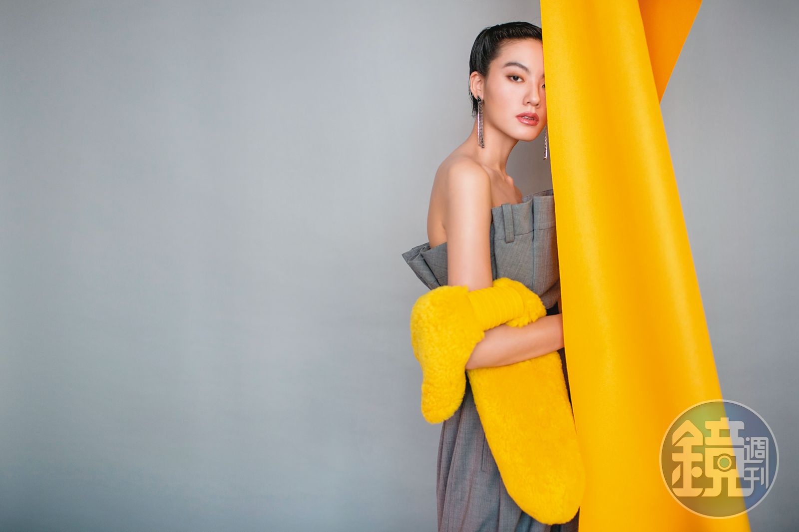 灰色長褲造型連身褲 NT$116,300 by MOSCHINO/黃色翻羊毛長脖圍巾 NT$50,100 by BOTTEGA VENETA/三角標誌流蘇耳扣 NT$14,000/單支 by PRADA/鉛灰色刺繡帆布腰帶 NT$33,000 by Dior