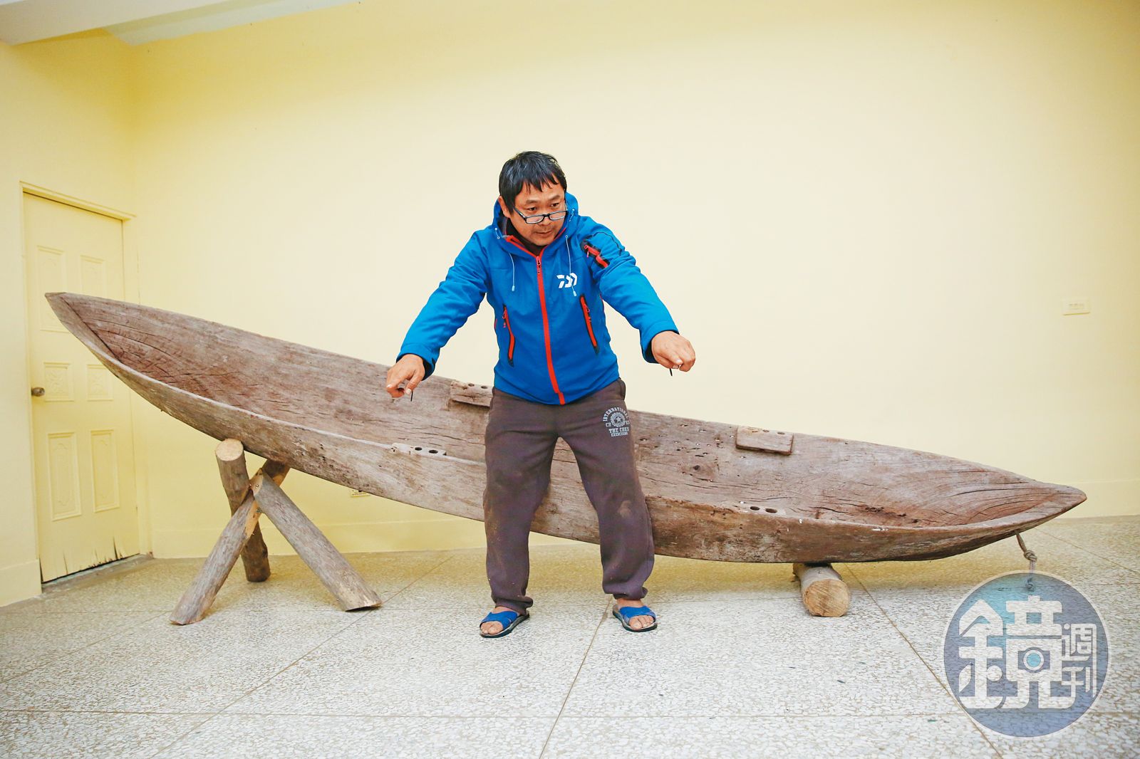 林榮康在有百年歷史的獨木舟前,解說先民如何利用獨木舟遠航。發布時間:2021.01.19 05:58 臺北時間