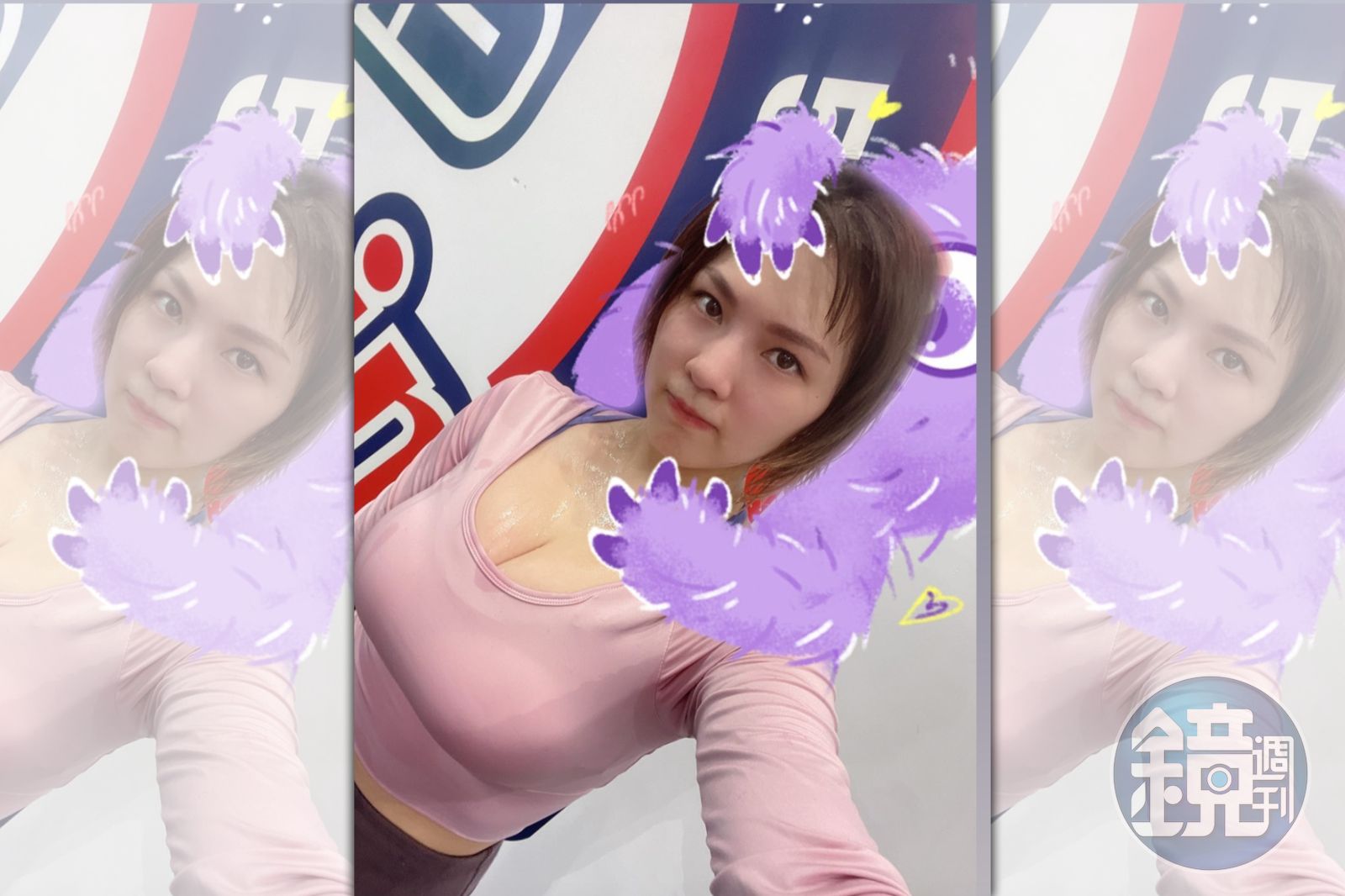 熊熊身穿粉色超緊身上衣,傲人上圍快包不住,熊熊身上全是汗水,脖子到鎖骨全被汗水浸透濕亮亮的,身旁的教練還指示「再來一下!」熊熊瞪了一下鏡頭,搞笑寫道:「做到生氣的部分。」