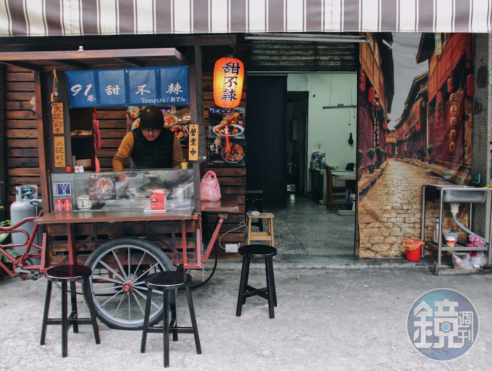 走進巷中,會先看到當作是招牌的旗幟,再往右手邊一看,可愛的攤車就是了。手邊忙著外帶,老闆也不忘招呼:「天氣很冷,內用要不要坐裡面吃?」除了攤位上,還有屋裡的座位,裡面擺放了很多印刷機器,一問之下,才知道那是老闆至今仍還在做的本行。甜不辣一下就上桌,上頭的淋醬感覺和平常吃到的有點不同,老闆說除了淋醬,辣椒醬也是他自己調配的。
