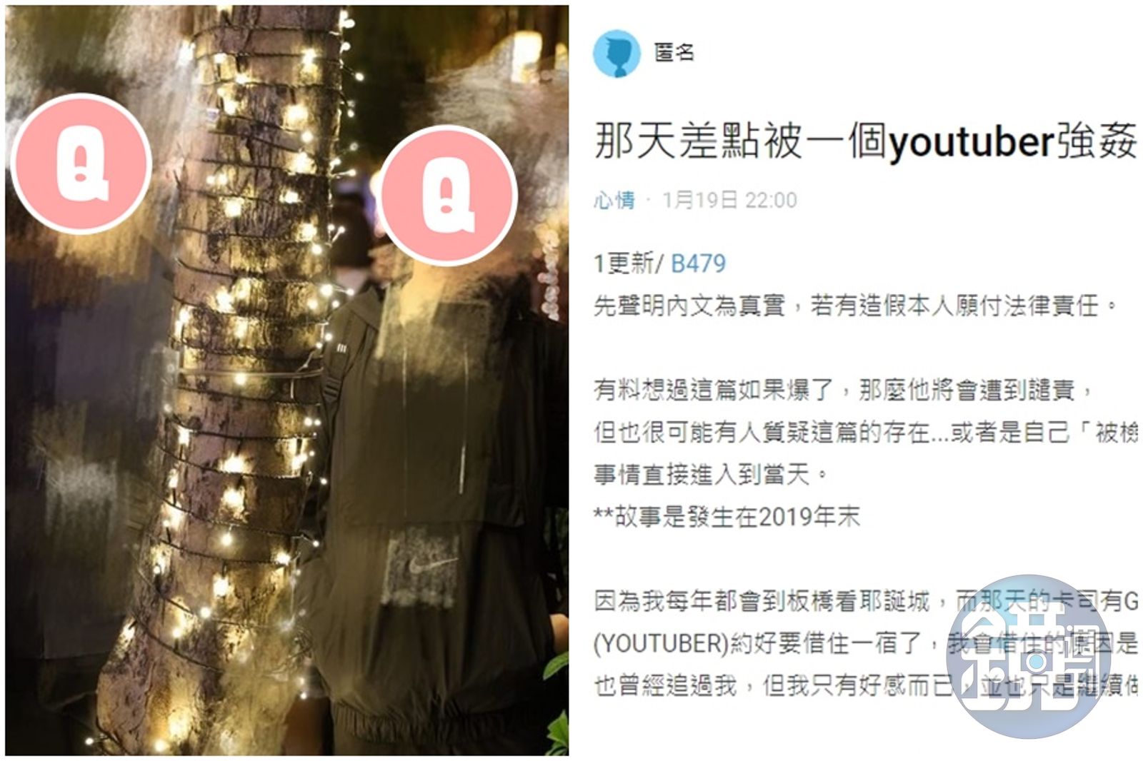 一名網友在Dcard發文爆料,表示雙方早認識2年,前年到新北市看耶誕城表演,事先提早與該名YouTuber約好借住一宿,透露該YouTuber曾追求過他,但因對方在YT界很夯,讓原PO認為兩人差距過大,因此未發展進一步關係,並繼續做朋友。