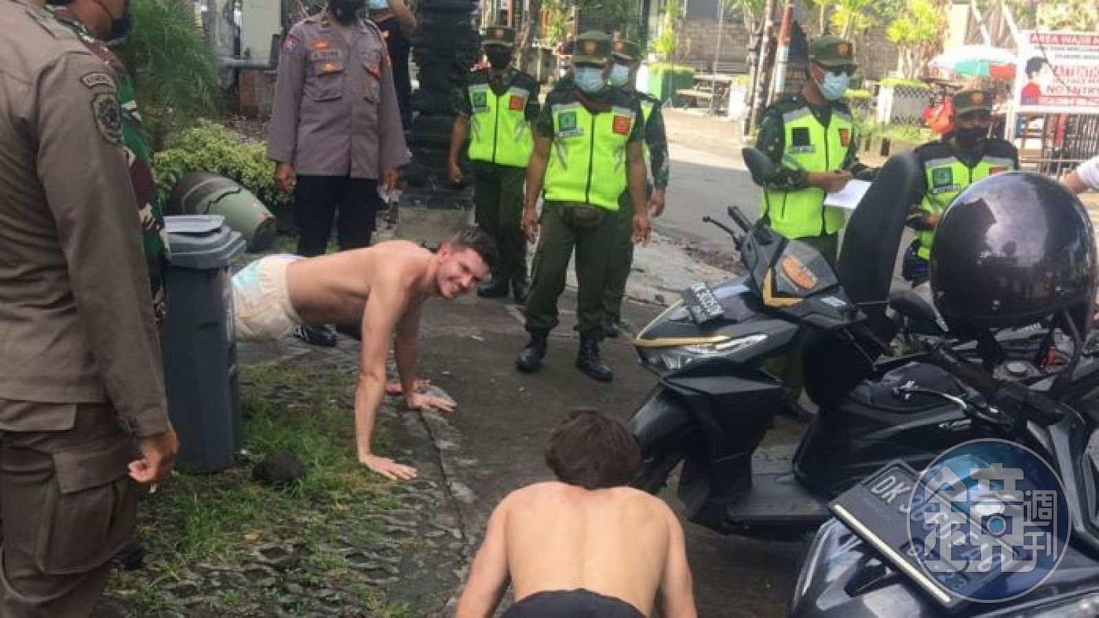 據外媒報導,數名在峇厘島觀光的白人遊客,因為被當地警方抓到沒有好好戴口罩、違反防疫規定,被要求直接就在街上做25個伏地挺身當作懲罰,隨後警方會給他們口罩就直接放人。