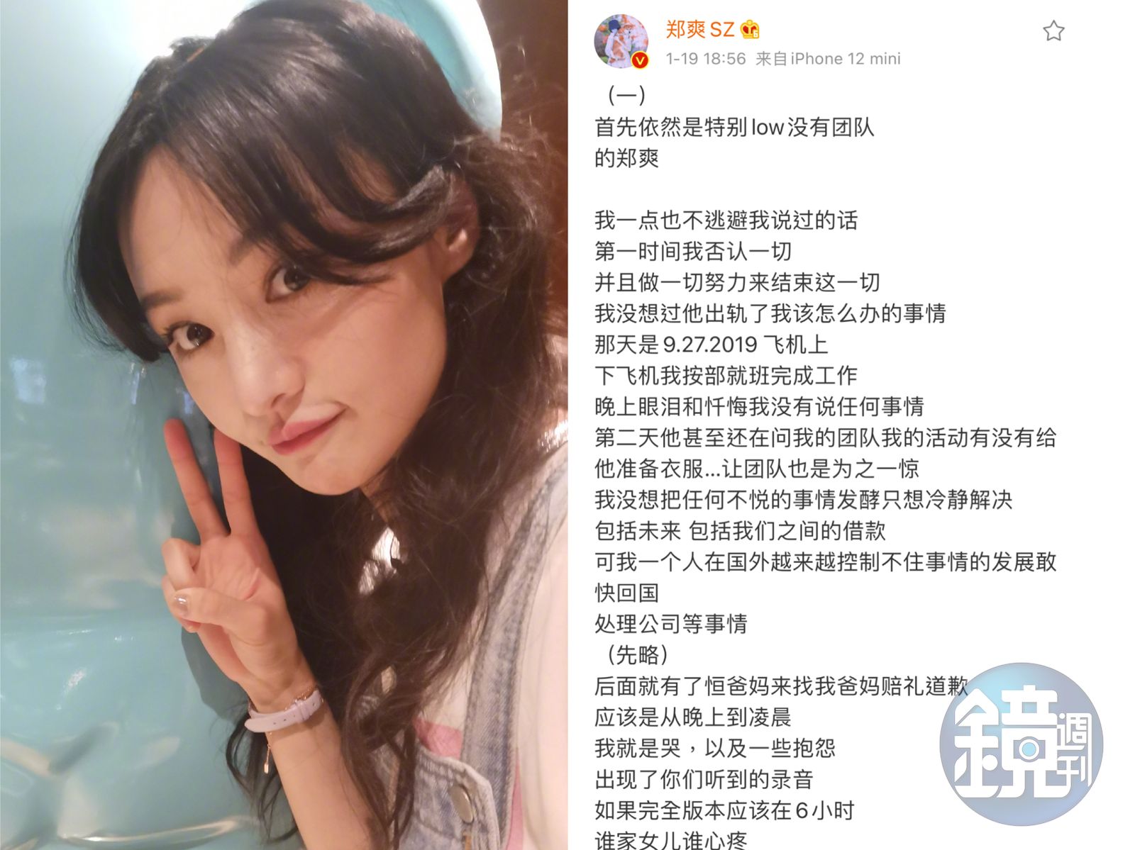 在代孕加棄養風波發酵後,鄭爽數個代言搖搖欲墜,PRADA率先發出聲明稱「PRADA集團已終止與鄭爽女士的所有合作關係」結束短短8天的代言。鄭爽眼見苗頭不對好像得做點反應才行,於是按以往套路「裝悲情」,先發文暗指錄音被掐頭去尾曲解,並透露當初分手是因為張恒劈腿,鄭爽父親也跟著發文怒批張恒一家子都是壞人等等情緒語言,但不論怎麼做卻都引不起網友認同,反而覺得他們一家在刻意模糊焦點。