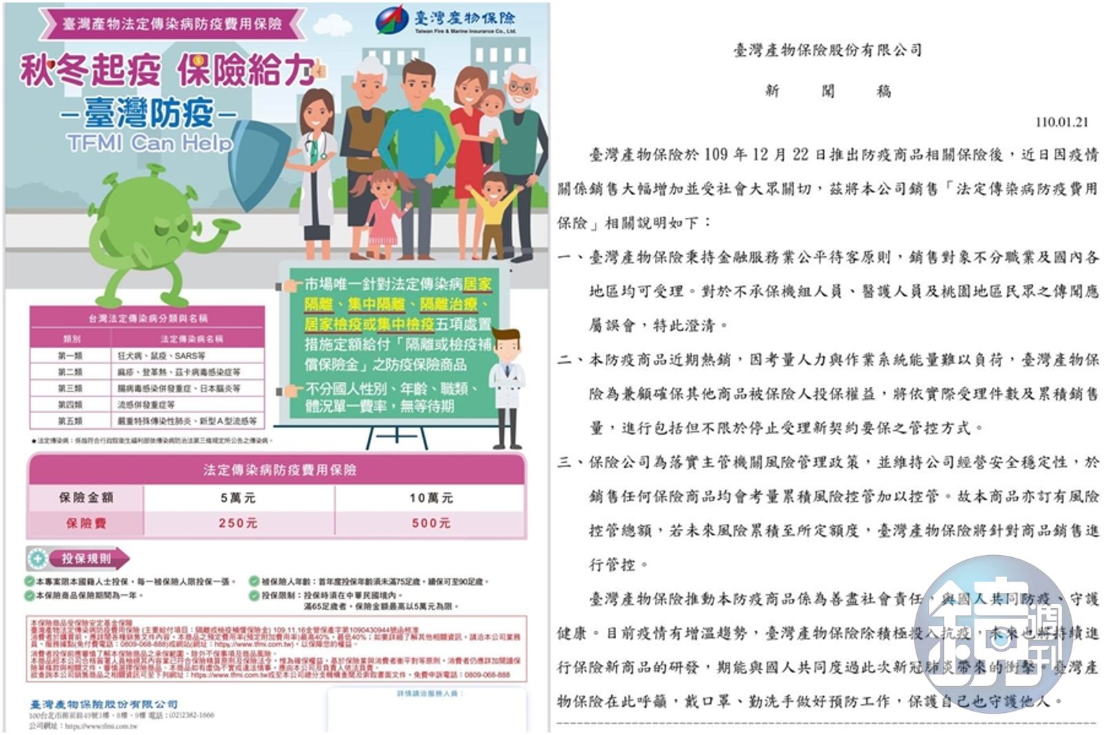 台產表示,本公司銷售「法定傳染病防疫費用保險」,近日因疫情開係銷售大幅增加並受社會大眾關切,因此做出以下說明: