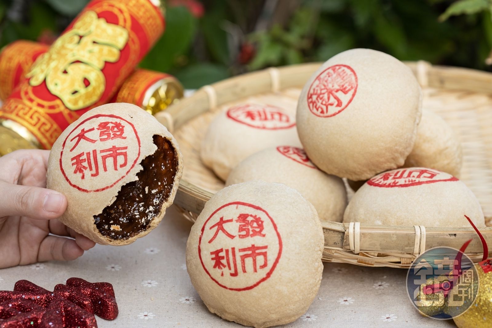 原料只有黑糖、麥芽糖、麵粉、水的黑糖香餅,用料講究,使用新竹寶山黑糖、台南百年新順發行的麥芽糖,何錫銘的女兒、第5代何玟儀遞來一顆,我剝開薄薄外殼,黑糖軟餡濕潤光亮,甜滋滋不黏牙,還沒採訪完就嗑光一顆,「關鍵在火候,進烤爐的時間,什麼時候翻面,全靠經驗。」何玟儀說。過年推出印有「大發利市」紅字的限定款,拿來當零嘴,拜拜討個賺大錢的好兆頭,喜氣爆棚。
