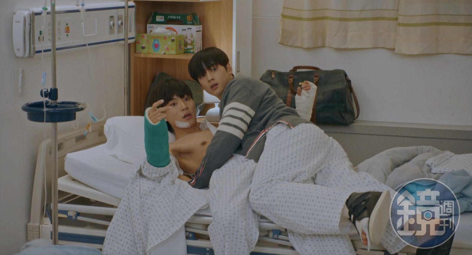 第11集中車銀優(左)和黃仁燁因車禍受傷,車銀優傷到腳,黃仁燁則是雙手骨折。(翻攝自tvN DRAMA Twitter)昨晚播出中,車銀優和黃仁燁化解誤會,因車禍住院中的兩人恰巧一個腳受傷,一個手骨折,雖吵嘴不斷,但「口嫌體正直」的兄弟倆在醫院互相扶持。車銀優在幫黃仁燁換衣服扣扣子時,兩人一個腳滑不小心演變成車銀優「床咚」黃仁燁,被女友文佳煐抓包。