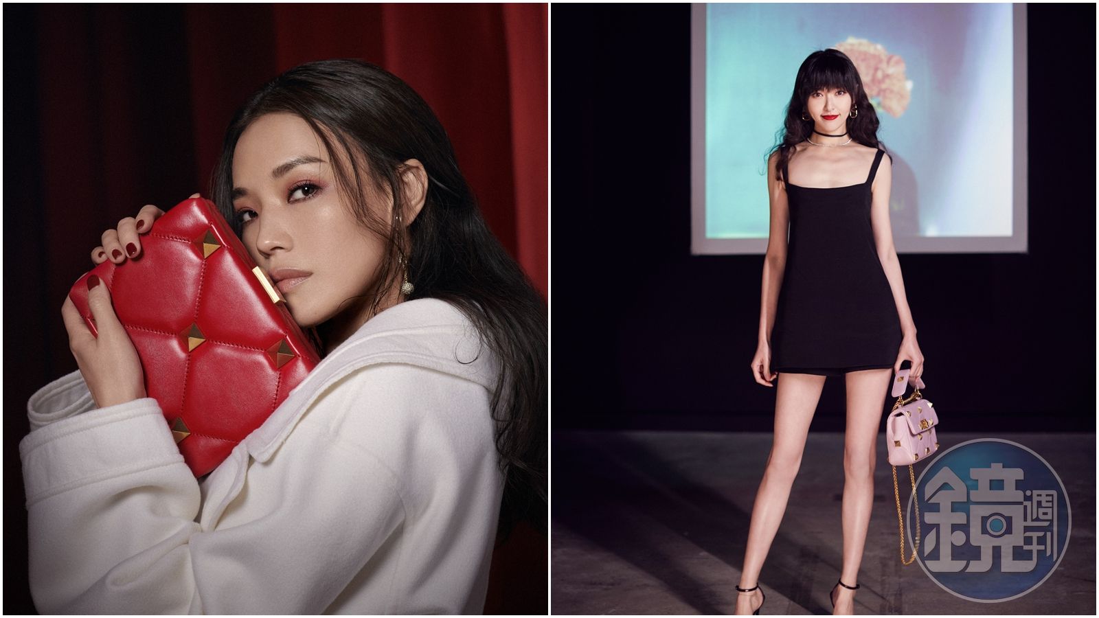 唐嫣手拎Valentino Garavani Roman Stud粉紫色小羊皮鉚釘鍊帶包。NT$95,000(Valentino Garavani提供)運用柔軟皮革交織而成的立體廓形以及銜接工藝勾勒出的格調紋理,充分演繹現代優雅與街頭美學的完美融合,整個系列包括包款、鞋履、皮革背帶,以及手環,都傳達出Maison Valentino企圖將美好寓意與新年願景溫馨傳遞的感受;看看舒淇的珠寶盒造型晚宴包,雍容中又顯性感的一抹紅,展現出華貴又高雅的氣質。