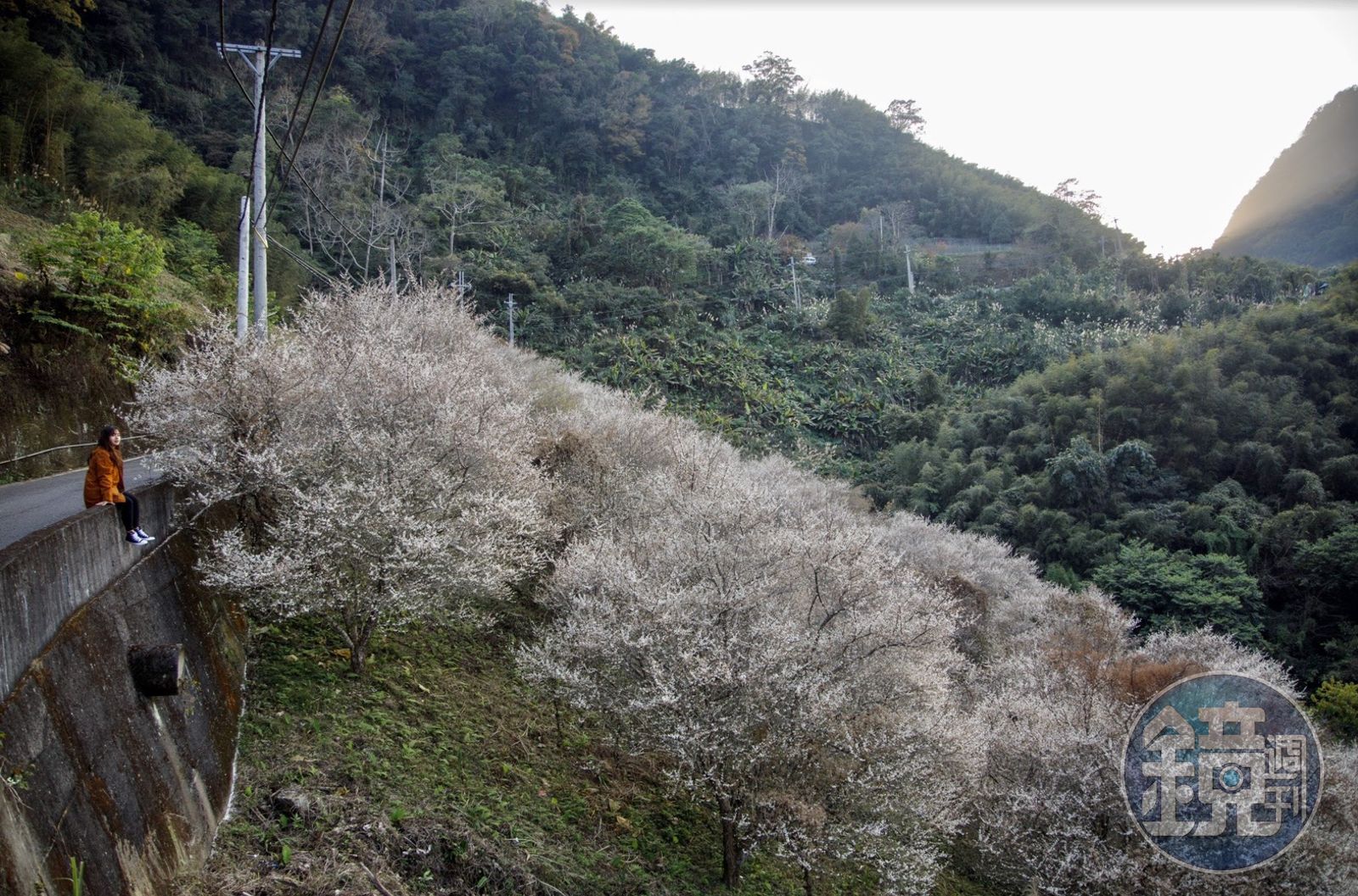 此趟旅程我們往台版嵐山竹林祕境前行,從清安豆腐街上山開往祕境大約20分鐘車程,在半山腰處,驚見純白花雪,攝影師一路上心心念念,決定趕在太陽西下前收工,下山捕捉美景。這片斜坡地種滿果樹,本週恰巧碰上盛放期,如白雪綻枝頭,夕陽灑下時,真的浪漫。