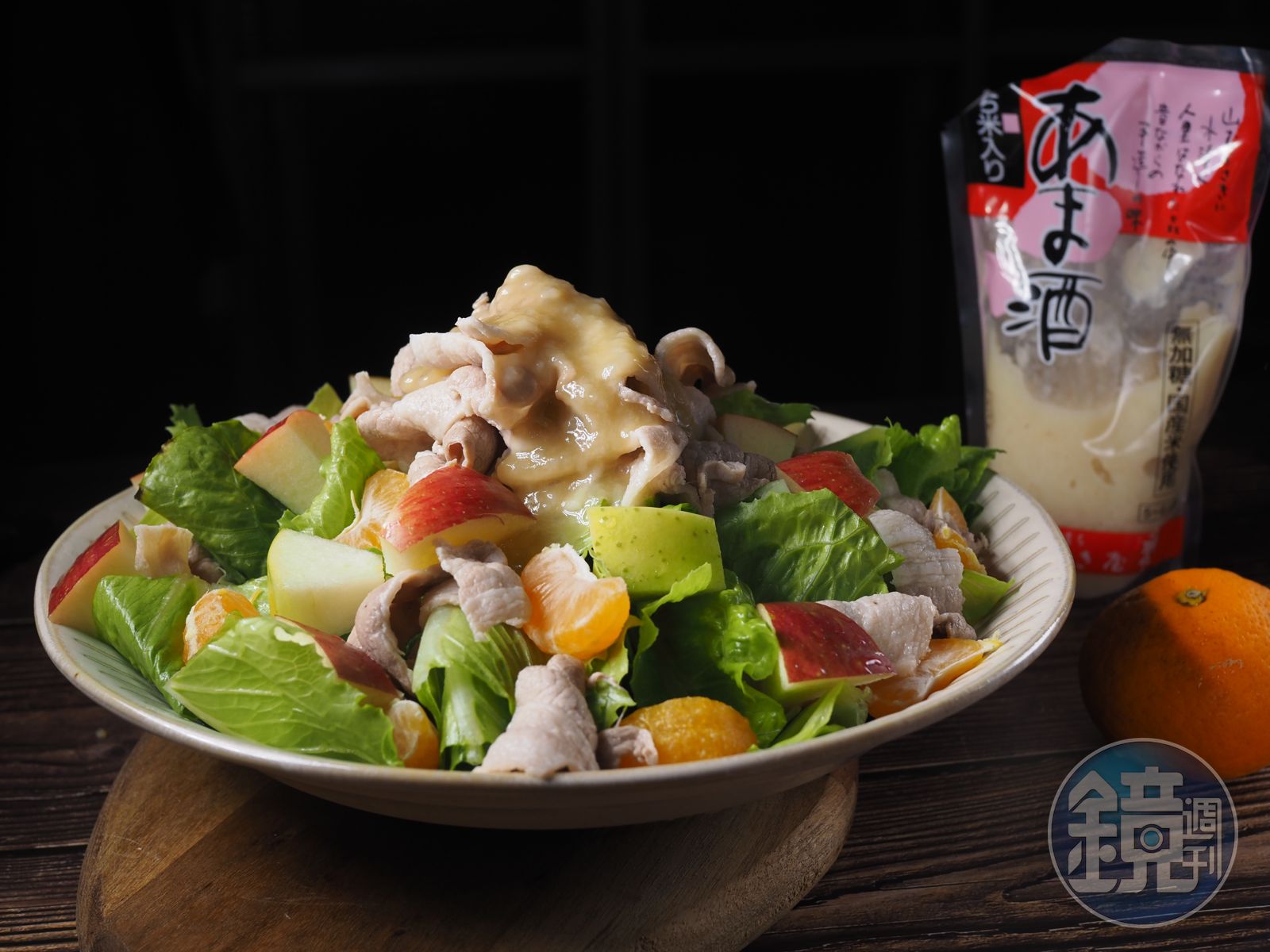 先做道甘酒沙拉。我用的是蘿蔓、橘子、蘋果和小番茄,只要把蔬果洗一洗切一切就行,你也可以用自己喜歡的蔬果。只有植物,覺得還是少了點分量感,所以我又加了點五花肉片,薄切的火鍋肉片用加了酒的滾水涮熟,馬上丟進冰水冰鎮,可以洗除油膩,增添嫩感。