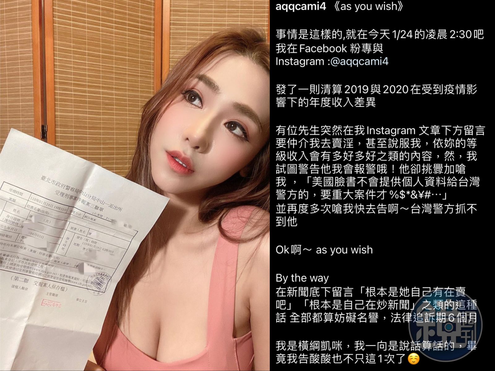 因為擁有F奶的火辣身材,橫綱凱咪擁有不少宅男粉絲,嗆辣言論更是屢上媒體版面,但就有不怕死的人想嚐嚐小辣椒的滋味。橫綱凱咪透露去年因疫情影響自己收入銳減,卻收到有人私訊要仲介她去賣淫。被這樣污辱橫綱凱咪當然不放過,她先警告對方表示要報警處理,誰知道對方不僅不退縮,還以臉書不會洩漏個資給台灣警方為由反嗆「報警吧!我滿想看妳可以告什麼的」。