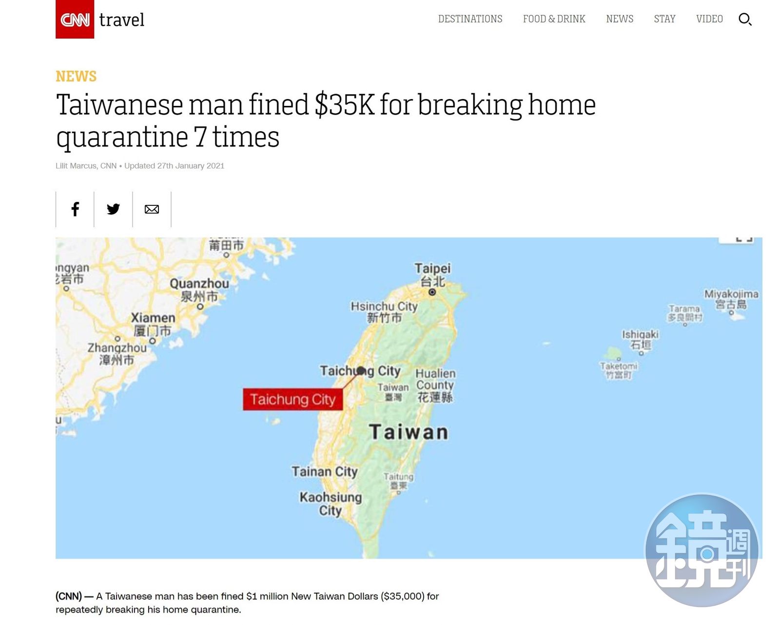《CNN》寫道:「在防疫方面,台灣一直是世界上成功的表率之一,台灣很早就實施邊境管制、大規模檢測和追蹤染疫接觸者,並嚴格實行隔離政策。」報導也提到去年12月,一名來自菲律賓的移工因踏出防疫旅館房門8秒,最後遭罰新台幣10萬元。