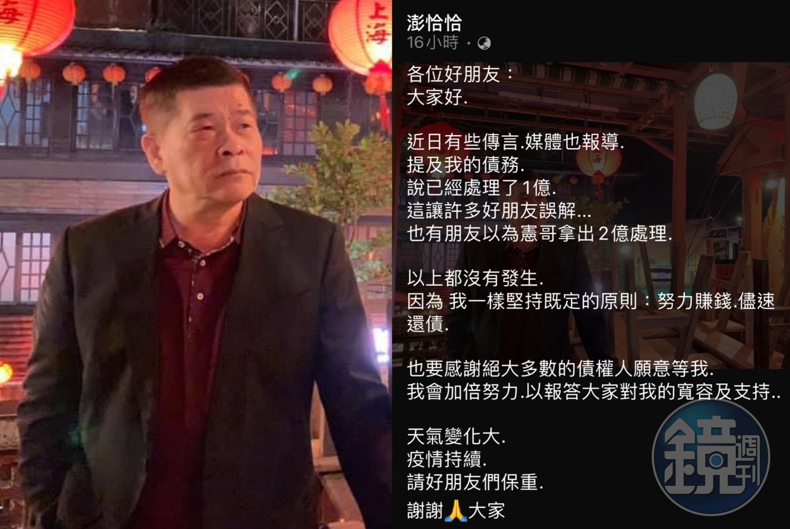 因為欠債正努力賺錢還債的澎恰恰,這個月初受吳宗憲邀請加盟電商直銷,當時吳宗憲在台上喊出「3年賺2億」,恰巧就是澎恰恰欠債的數字。因此有人繪聲繪影表示,吳宗憲拿2億幫澎恰恰還債,也有一說是澎恰恰已經還了1億,這讓澎恰恰的債權人產生了一些誤解。對此澎恰恰在臉書發文表示「以上都沒有發生」。