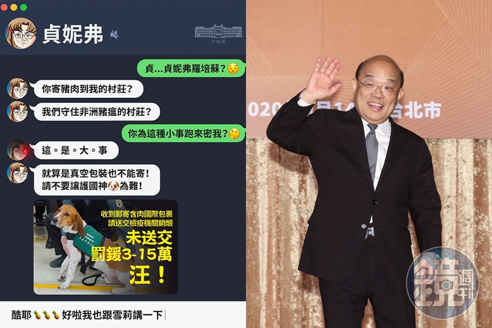 蘇貞昌昨(27日)晚在臉書發文,貼出一張與「貞妮弗」的對話紀錄,喊話國人:「非洲豬瘟威脅來勢洶洶,一刻都不能大意,不要從國外訂購含肉商品。」蘇貞昌也表示,政府雖全面使用X光和「護國神犬」檢查入境旅客的行李、國際包裹等,但還是要拜託國人從購物車開始就杜絕國外肉品,並且提醒若是收到國際肉品包裹沒有送給檢疫機關銷毀,將會被處以3萬至15萬元的罰緩,千萬不可大意。