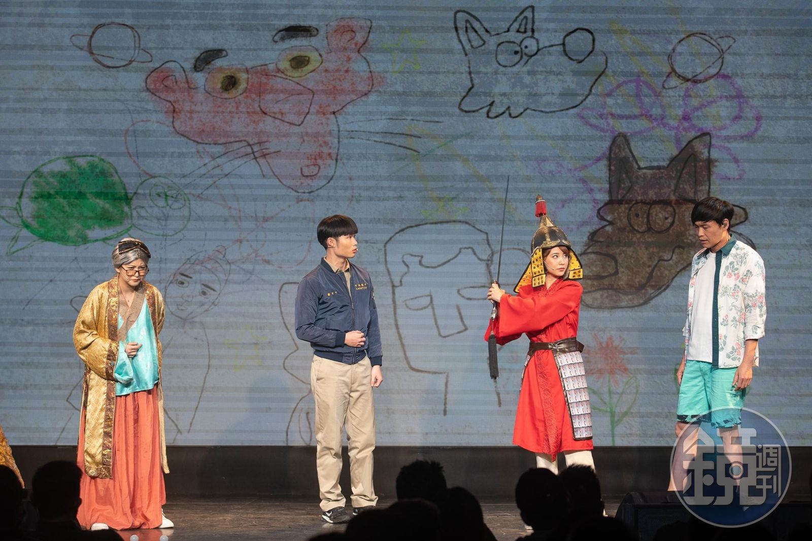 蕭言中經典單富漫畫的小紅帽與花木蘭,成為《童話秀逗秀》舞台劇的重要元素。(光源劇場提供)除此之外,陳柏澄特別擷取趣味故事穿插全劇,凸顯蕭言中搞笑又富想像力的一面。他笑說:「他童年頑皮常被媽媽罰跪,但自尊心強,怕左鄰右舍看到,就發揮創意讓自己看起來不像罰跪,像在地上找東西。」