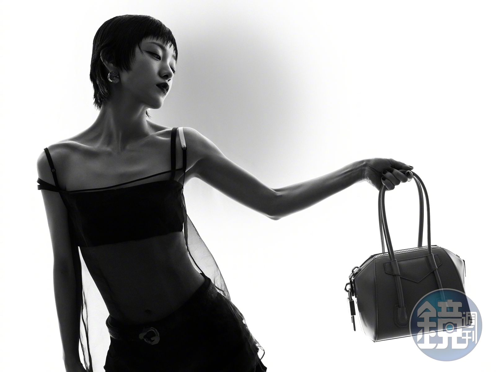 郭采潔在《小時代》飾演的「顧里」是一位總是身著華服的霸氣女子,而她在這場時尚活動中,以狗啃瀏海的打薄短髮、大紅脣膏與性感的黑色透視裝展現不同的風情;平胸透視裝上秀鎖骨下秀蠻腰,超短褲下一雙長腿更是吸睛。