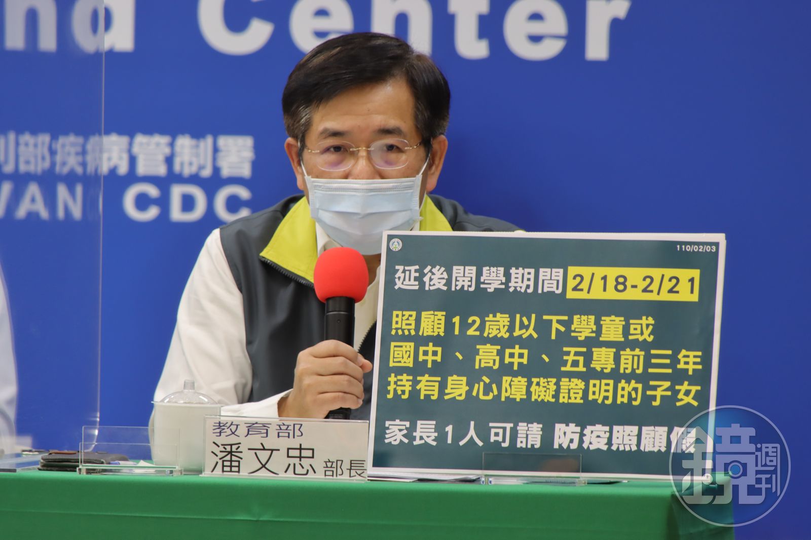 因應高中以下延後開學可能造成民眾困擾,潘文忠表示,只要家中需要照顧12歲以下學童或是國中、高中和五專前3年持有身心障礙證明子女,家長1人可請防疫照顧假;依勞動部規定,防疫照顧假因係防疫應變處置的特別措施,雇主應予准假,且不得視為曠工、強迫勞工以事假或其他假別處理、不得扣發全勤獎金、解僱或予不利處分。