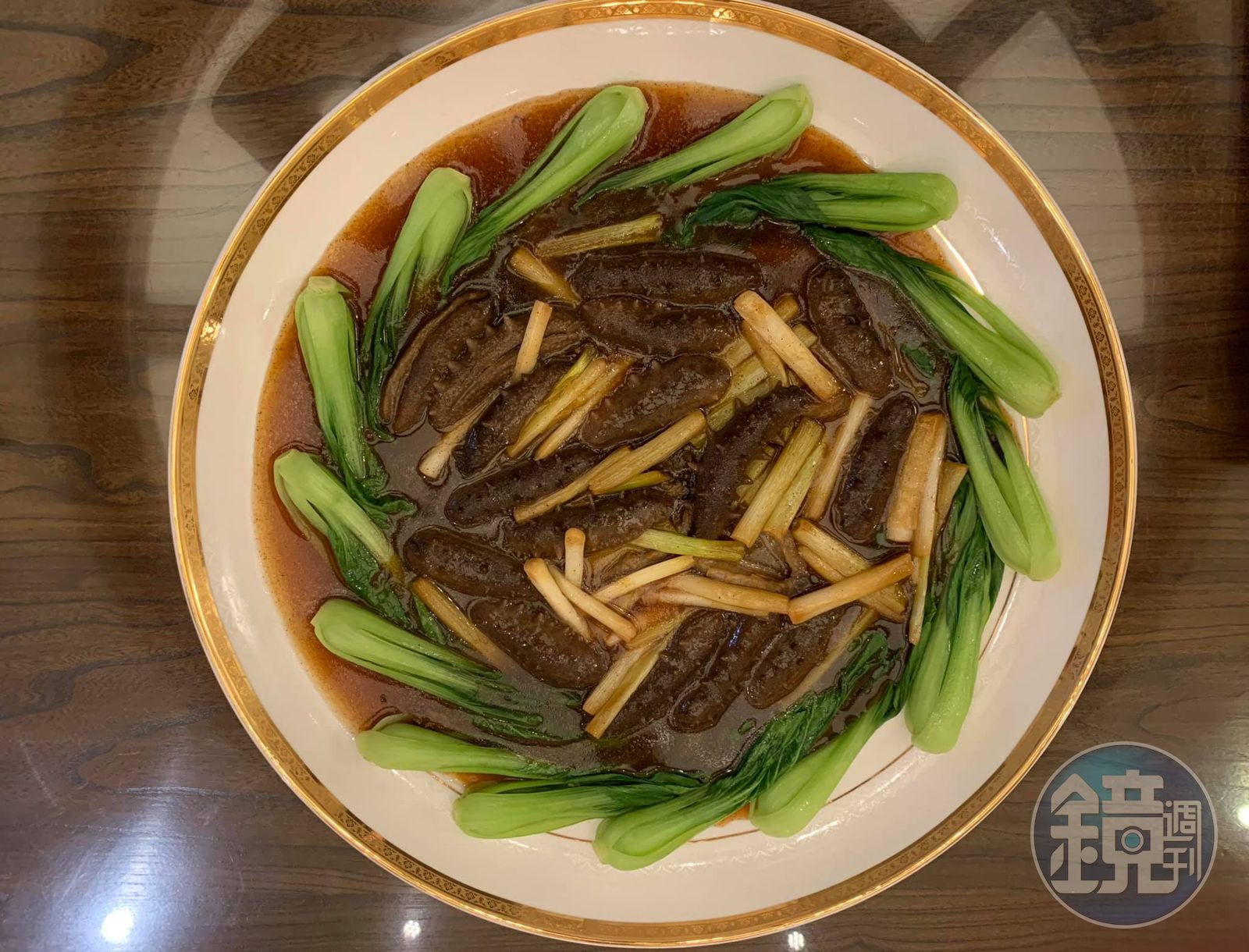 入刺參,翻炒一下,海參久煮會縮,所以大火收一下汁即可起鍋。在起鍋前,不要忘了加一把煸香過的蝦籽添香。若湯汁不夠稠,可勾芡一下。然後放在已燙的青江菜盤當中,隆重上桌。整支刺參裝盤,用刀义吃。軟腍滑口,鮮美異常。