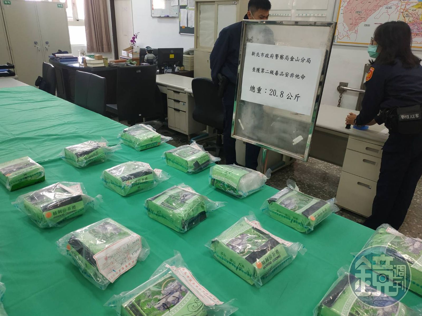 金山警分局獲報立即成立專案小組,擴大調閱進出岸邊車輛監視器畫面分析來往人車,懷疑毒品可能來自海巡署、高雄市警方去年4月在屏東外海查獲「日翔12號」遊艇翻船走私案,兩者查獲的真空茶葉包裝安非他命具有高度關聯性,經專案小組派員南下比對,其印製字樣及位置均極為相似。