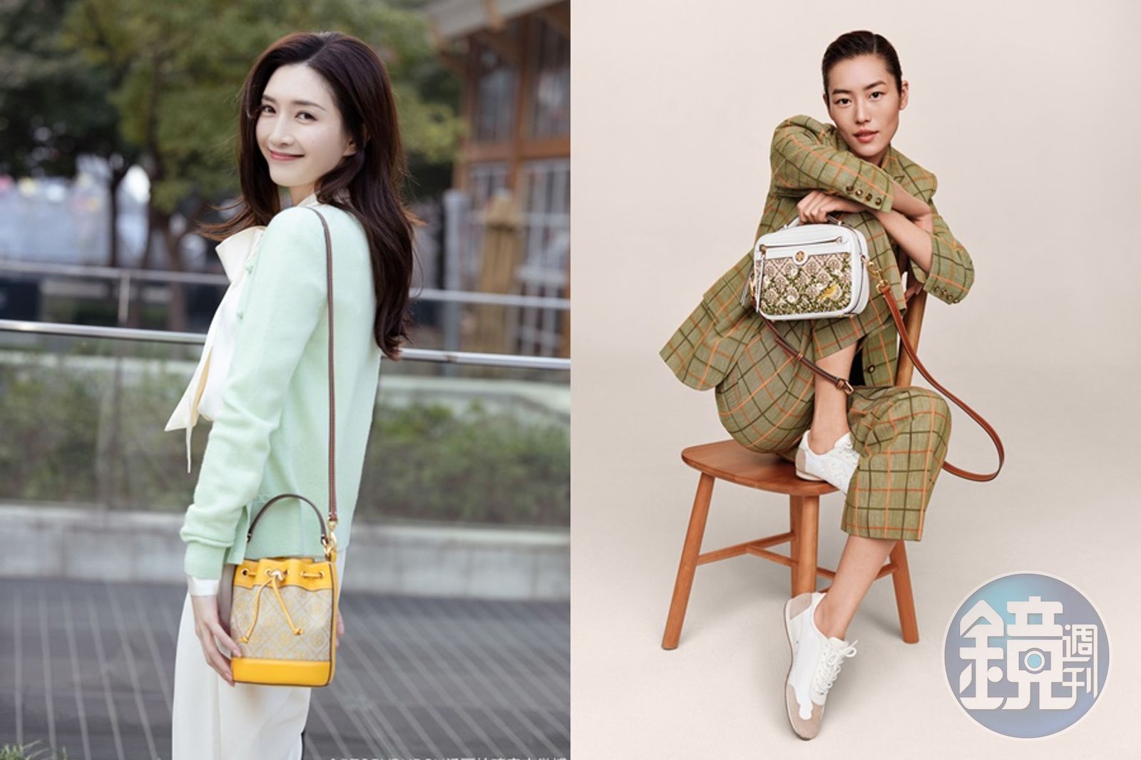 (左)大陸女星江疏影示範T Monogram迷你水桶包。NT$13,900、(右)超模劉雯為T Monogram拍攝形象圖。花鳥刺繡T Monogram相機包NT$20,900(Tory Burch提供)發布時間:2021.02.06 19:15 臺北時間