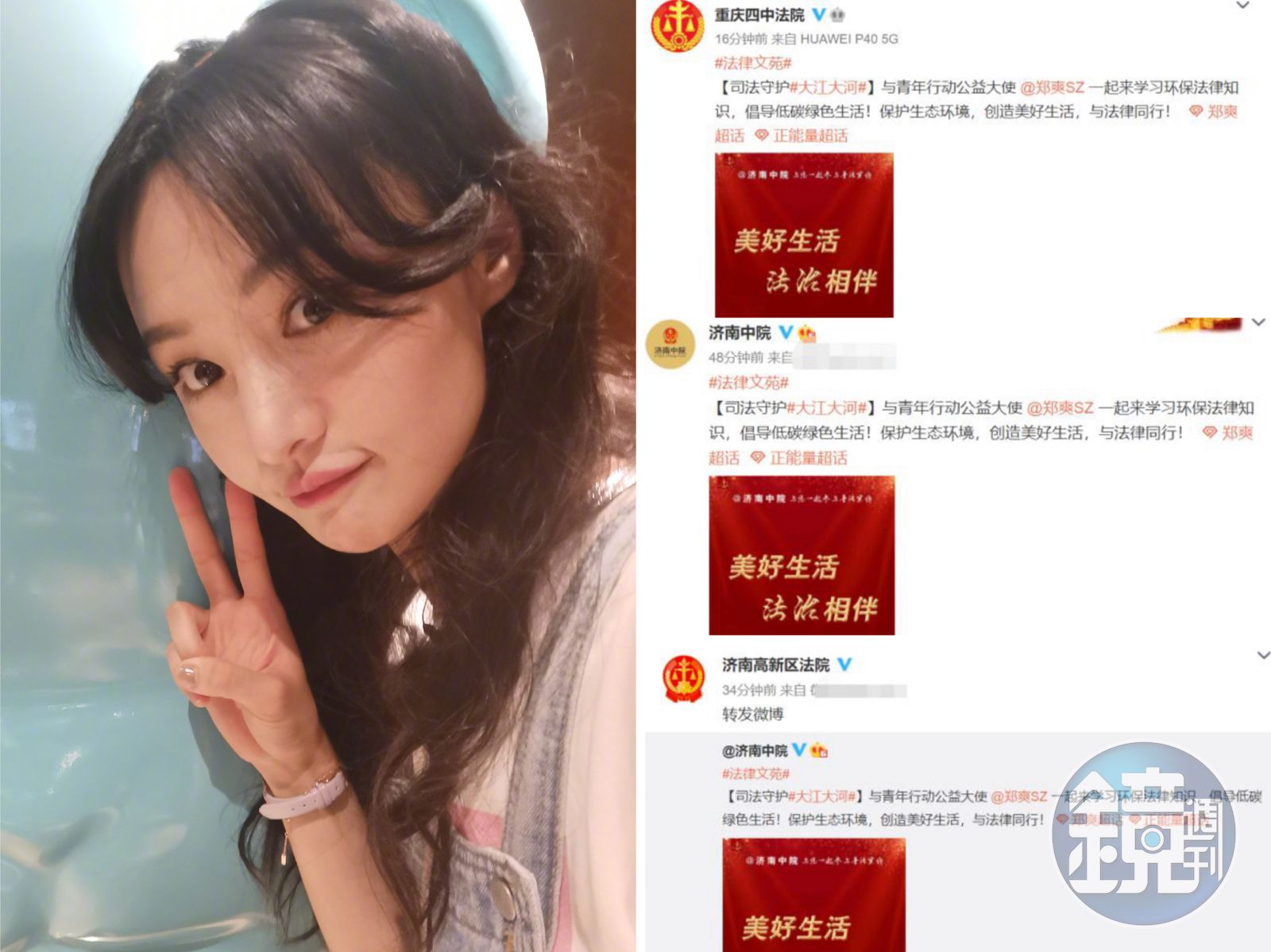 2月4日,卻有包括「重慶四中高院」「濟南中院」「濟南高新區法院」在內的3家官博分享了關於鄭爽的3條動態,寫道:「與青年行動公益大使鄭爽一起學習環保法律知識,倡導低碳綠色生活,保護生態環境,創造美好生活,與法律同行。」還特意標記鄭爽。讓鄭爽粉絲看到興奮不已,但也有其他網友直批「大家要不要這麼健忘」。