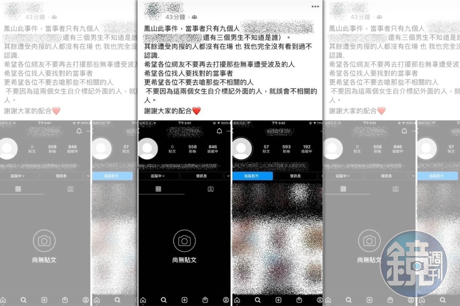 針對少女被霸凌事件,高雄警方於4日已將涉嫌霸凌少女的9名男女帶回偵辦。受害少女在個人臉書上發聲,指出「鳳山此事件,當事者只有9個人」,她將其中6人姓名列出,表示由於太多不相干、不知情及她根本不認識的人都被肉搜,希望網友不要再去打擾無辜的人,以免影響他人的生活。