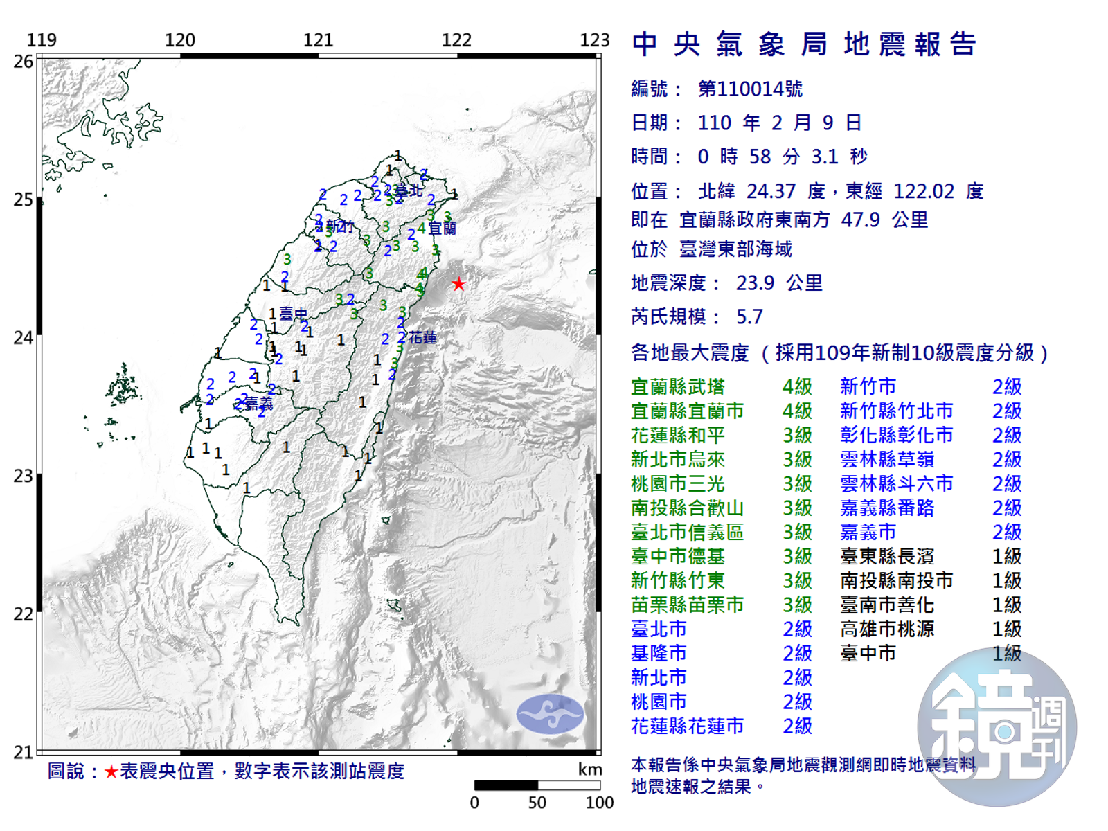 中央氣象局接著指出,宜蘭外海今日凌晨12時58分發生顯著有感地震,地震深度23.9公里、芮氏規模5.7,宜蘭縣最大震度4級,花蓮縣、、新北市、台北市、南投縣、台中市、新竹縣、苗栗縣最大震度3級,而基隆市、新竹市、彰化縣、雲林縣、嘉義縣、嘉義市最大震度2級,台東縣、台南市、高雄市最大震度1級。