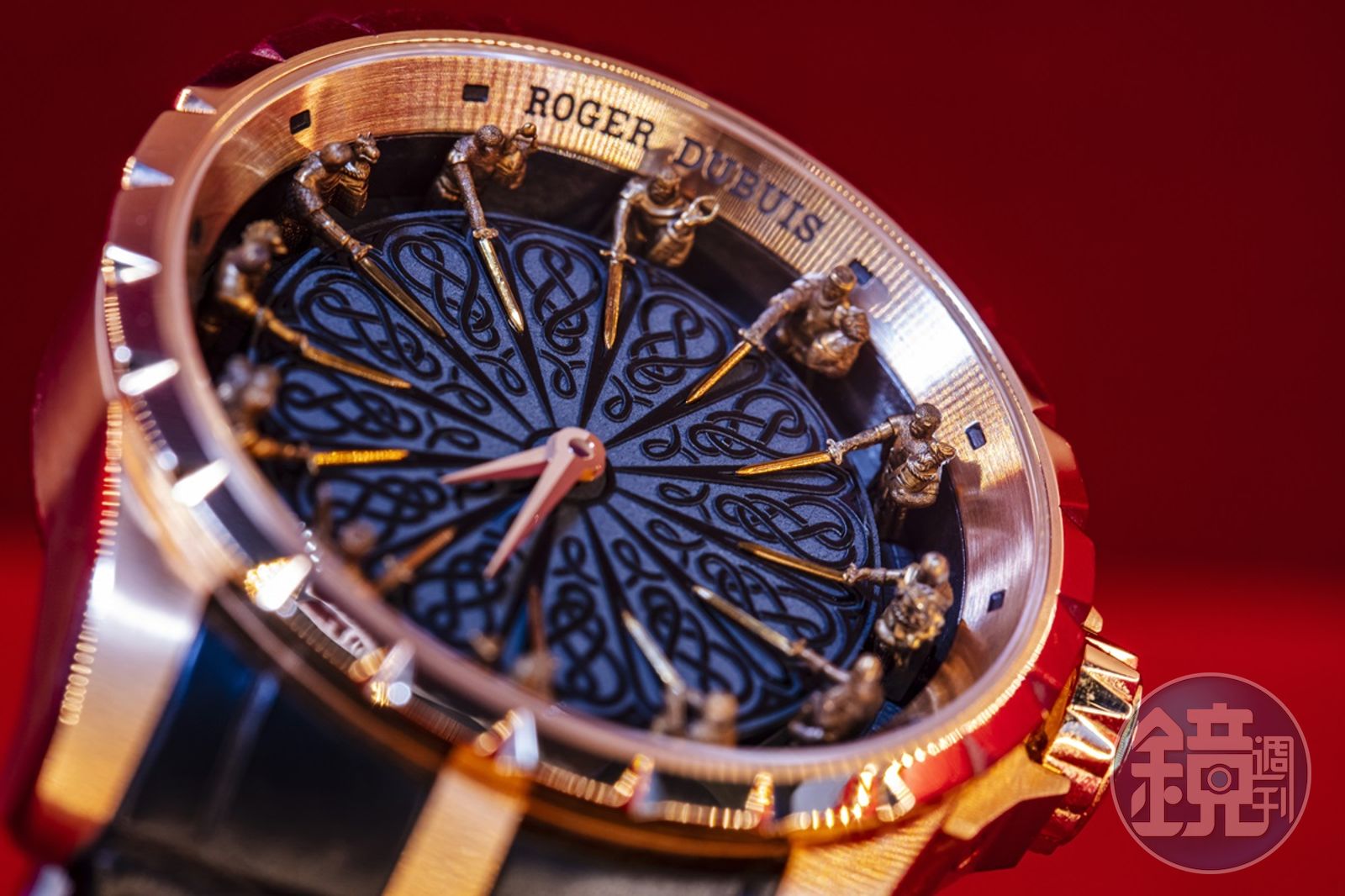 羅杰杜彼的「圓桌騎士」錶款最早發表於2013年,是以中世紀不列顛傳說「亞瑟王」帶領「圓桌騎士團」的故事為發想,把12騎士的形象以微型金雕呈現,並結合琺瑯、寶石等各種不同工藝。同時,這個「王者之劍」故事所帶有的特殊中世紀神祕感與哥德式美學,也成為羅杰杜彼品牌的象徵元素,可以說是羅杰杜彼從獨立製錶師品牌,轉型成為頂級製錶名廠的重要轉捩點。
