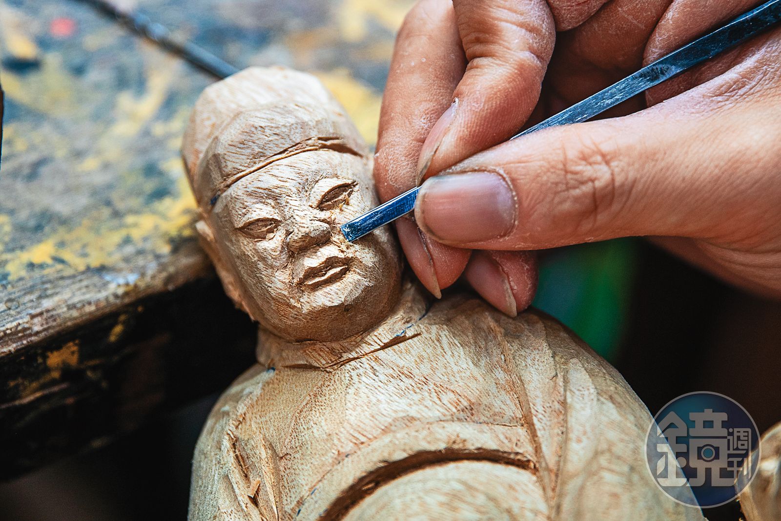 16道工法雖然都難不倒陳宗蔚,但他坦言最困難的步驟是刻畫神明的臉部。不僅努力在技法精進上,他認為熟知神明角色才能輔助製作神像過程中能將表情刻畫得維妙維肖,因此經常研讀各種信仰或歷史故事書籍,讓妝點出來的佛能更貼近書中描繪的形象,也會依照年代調整神明的服裝顏色。