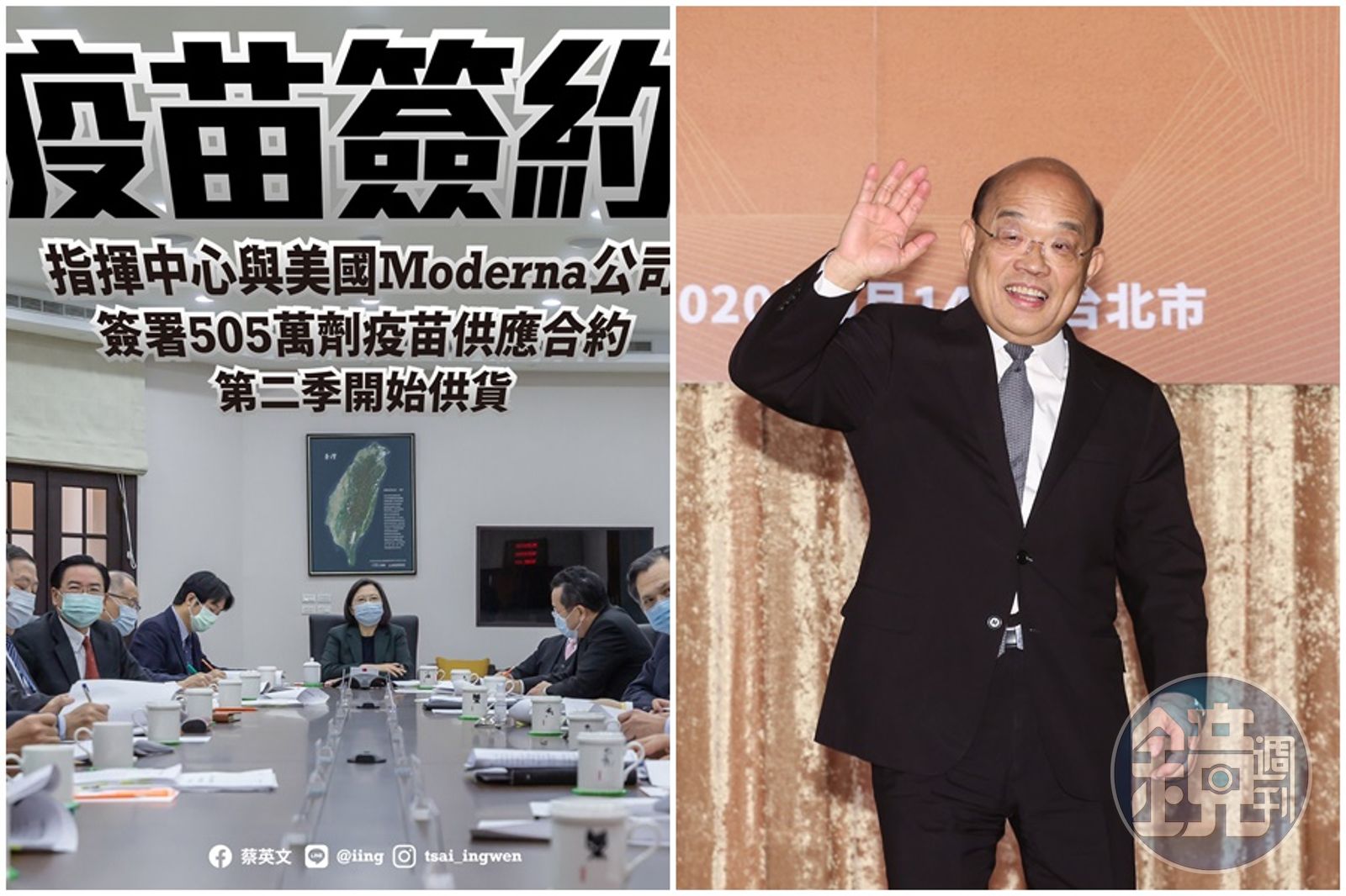 蔡英文在臉書指出,「昨天,我召開國安高層會議,討論疫苗取得的進度。今天指揮中心正式宣布:已和美國Moderna公司簽署505萬劑的COVID-19疫苗供應合約,預計今年第二季開始供貨。」並表示,各國積極取得疫苗時,能簽下龐大的供應合約,靠的是政府團隊跨部門的合作和努力。